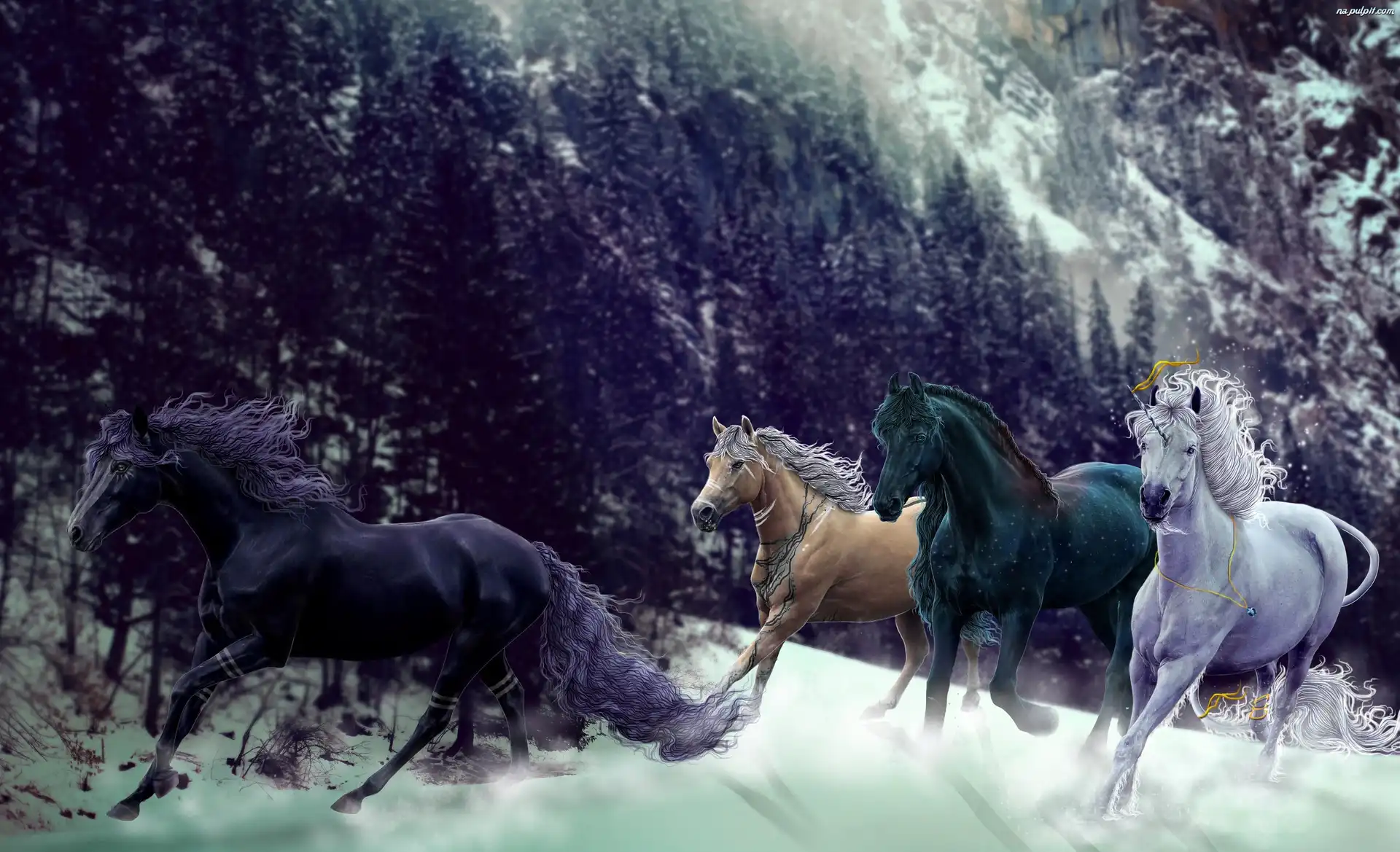 Drzewa, Śnieg, Konie, Góry Na Pulpit