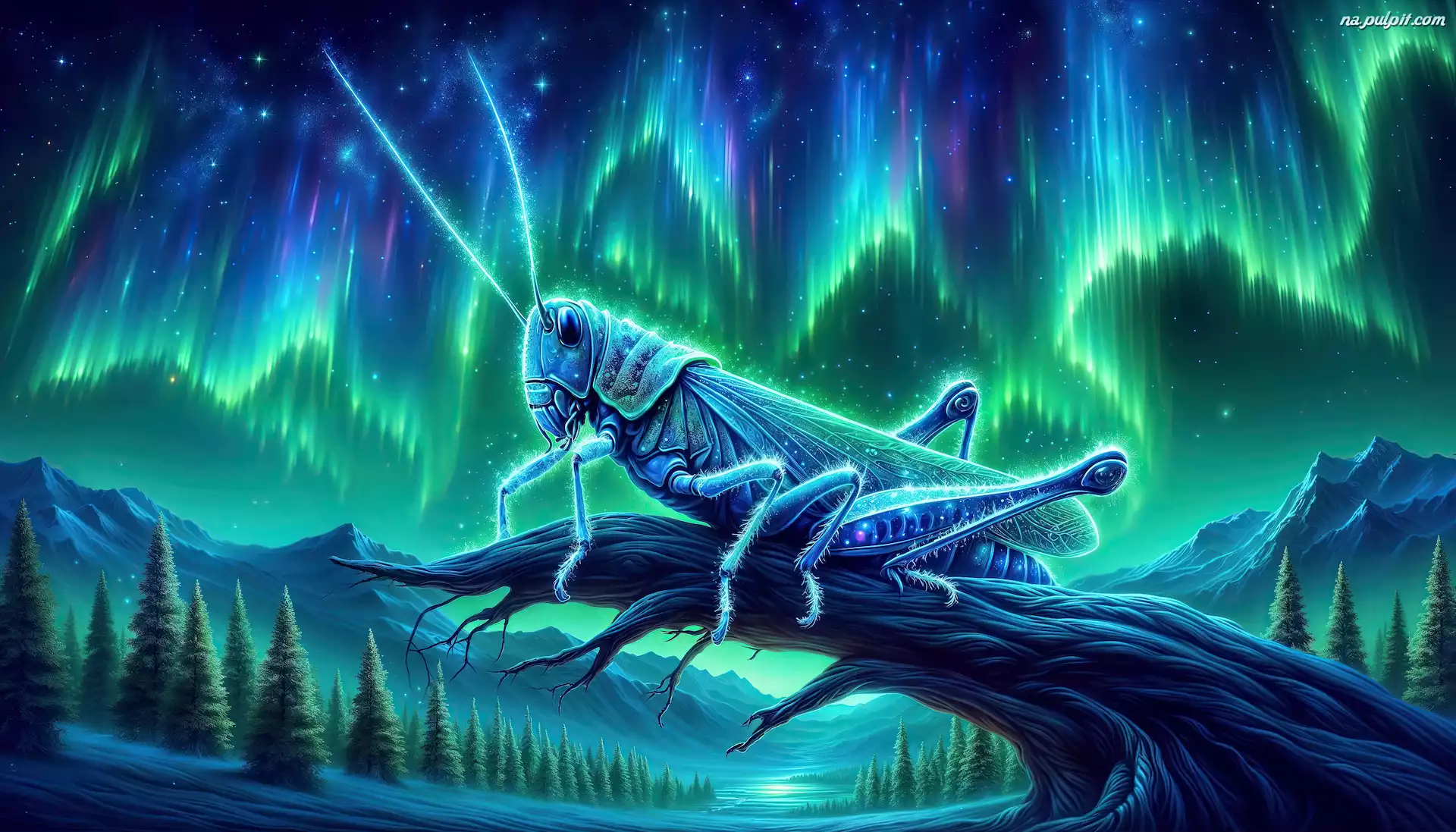 Drzewa, Grafika AI, Zorza polarna, Góry, Konik polny, Konar Na Pulpit
