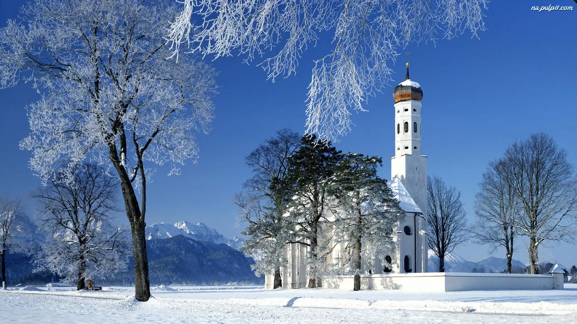 Śnieg, Kościół, Drzewa, Góry