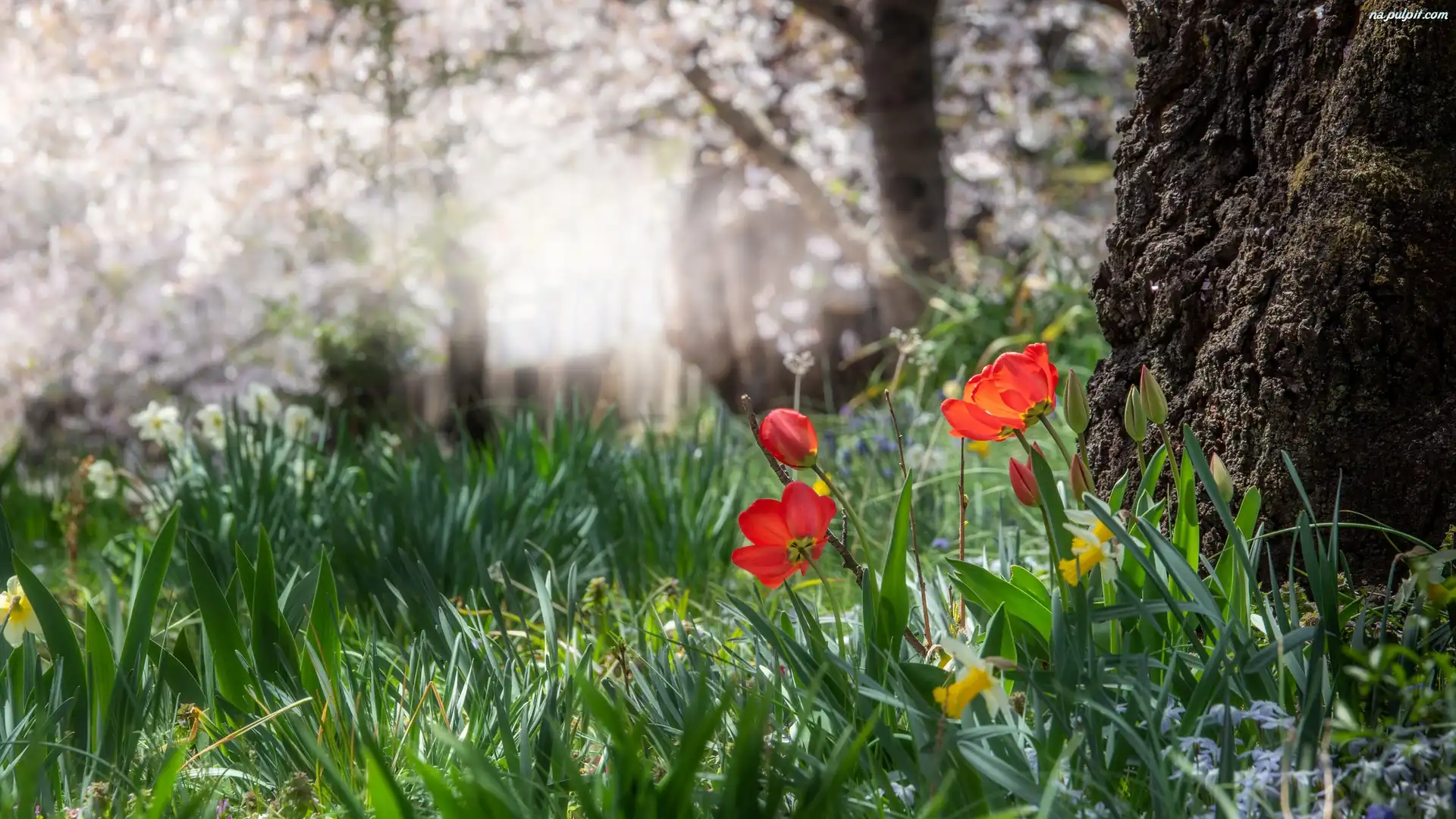 Drzewa, Tulipany, Kwiaty, Narcyzy