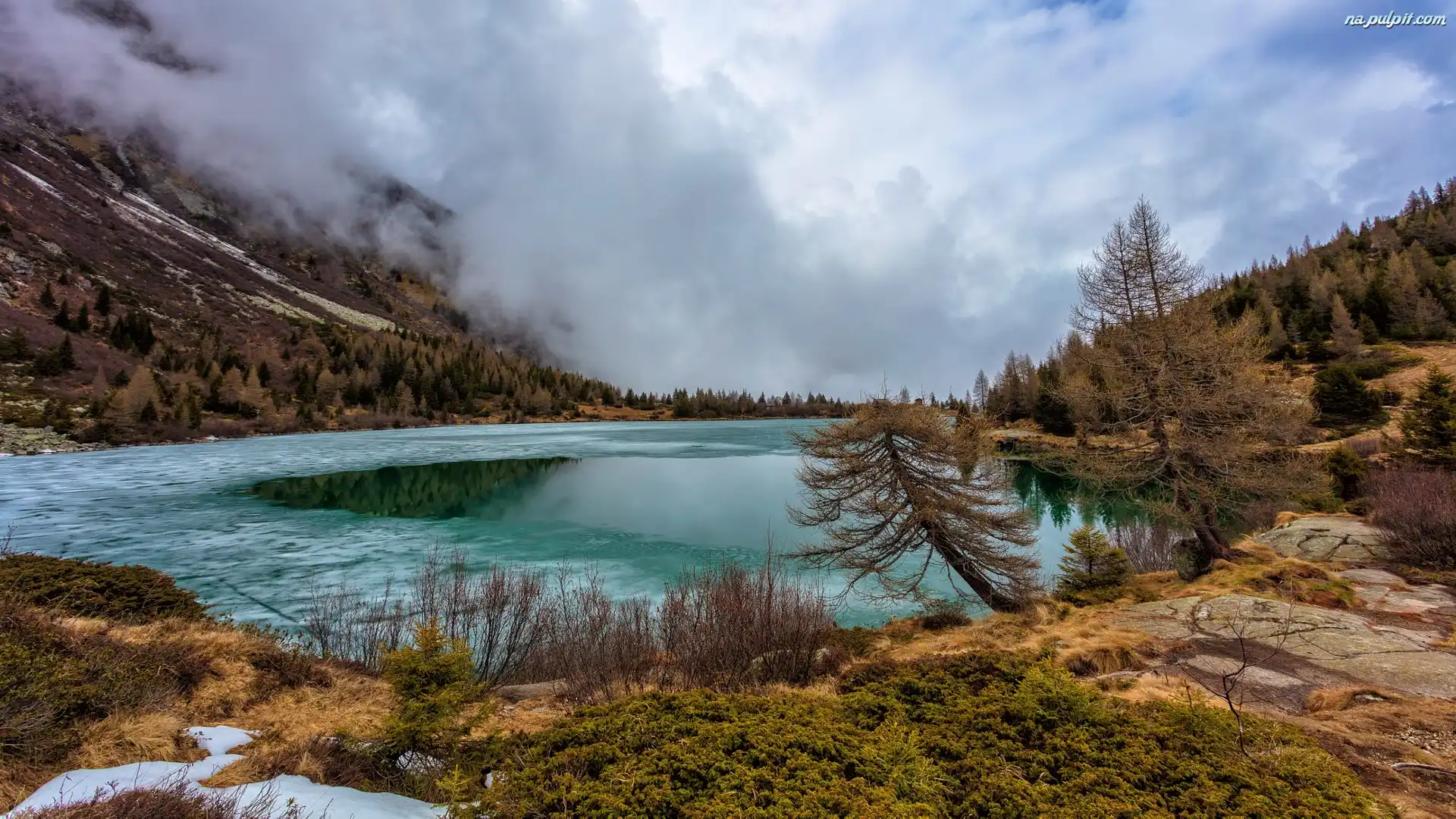 Mgła, Aviolo Lake, Jezioro, Włochy, Góry, Alpy, Drzewa Na Pulpit