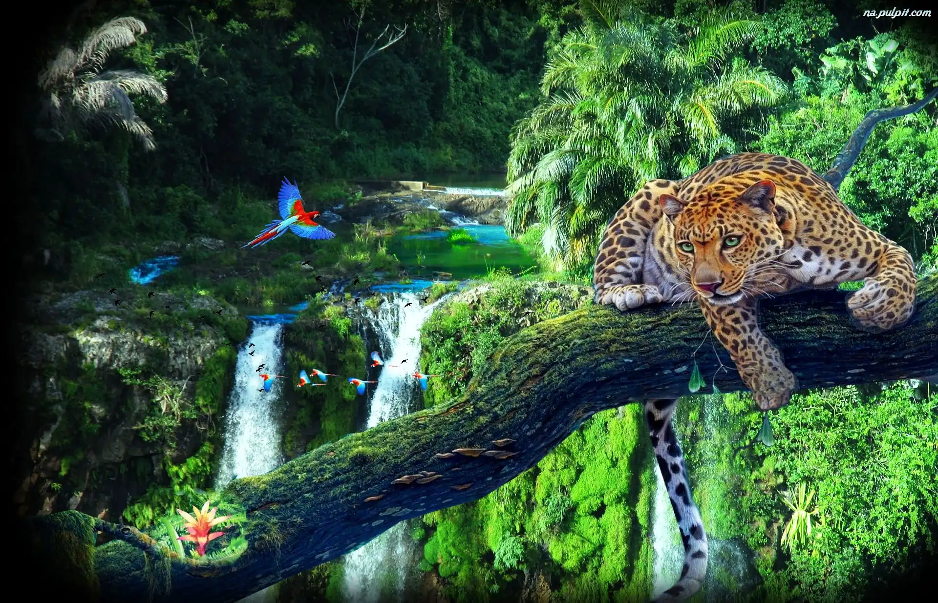Drzewa, Papuga, Lampart, Wodospad