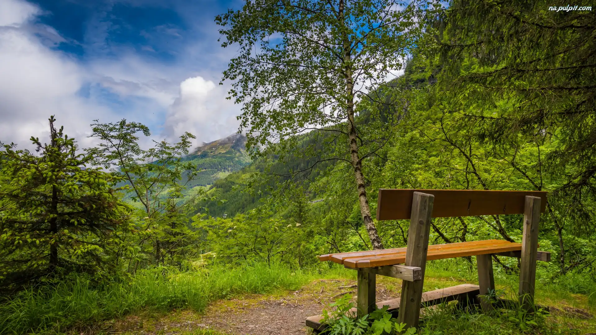 Drzewa, Niebo, Chmury, Zieleń, Las, Ławka Na Pulpit