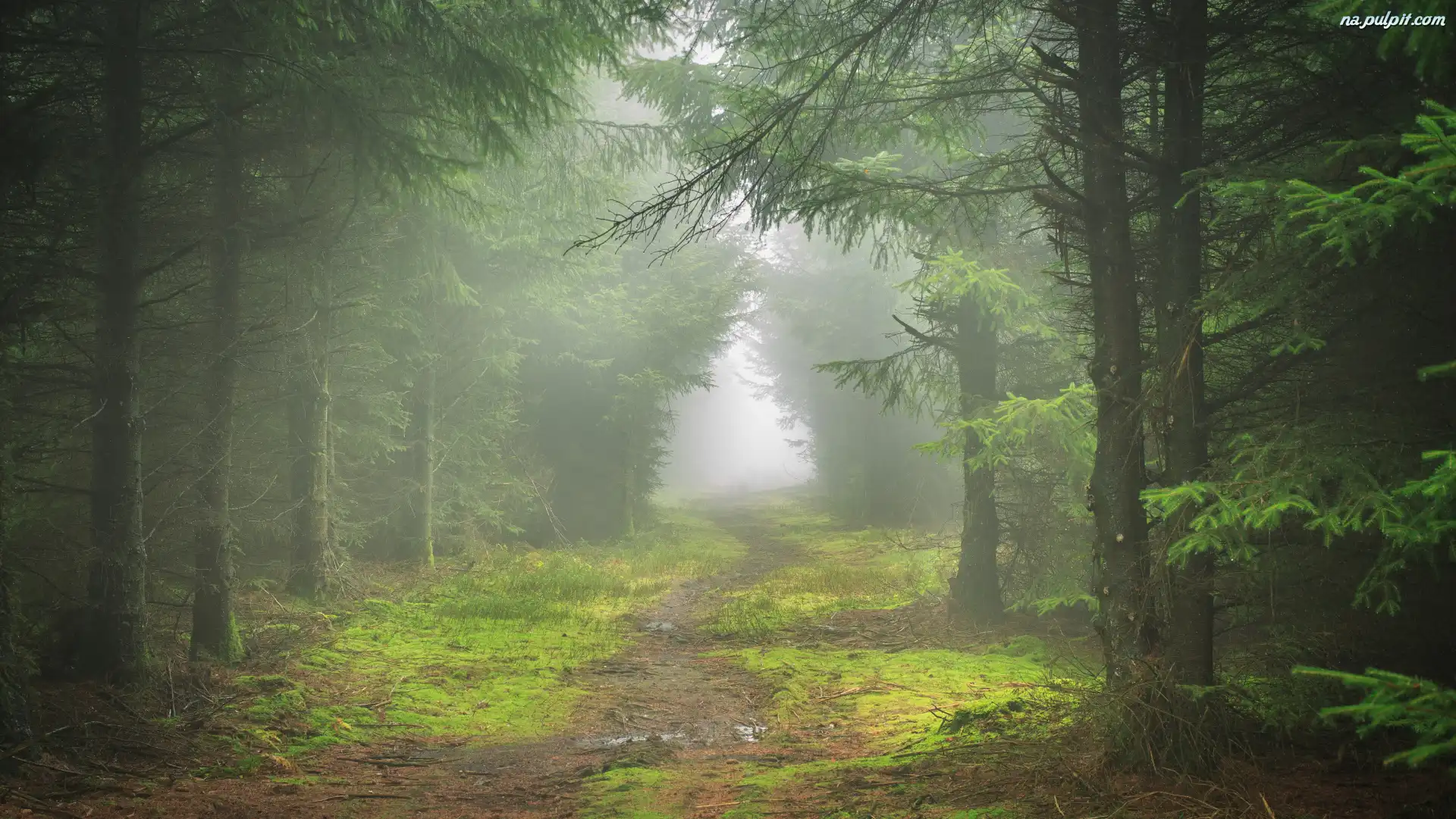 Drzewa, Droga, Las, Mgła Na Pulpit