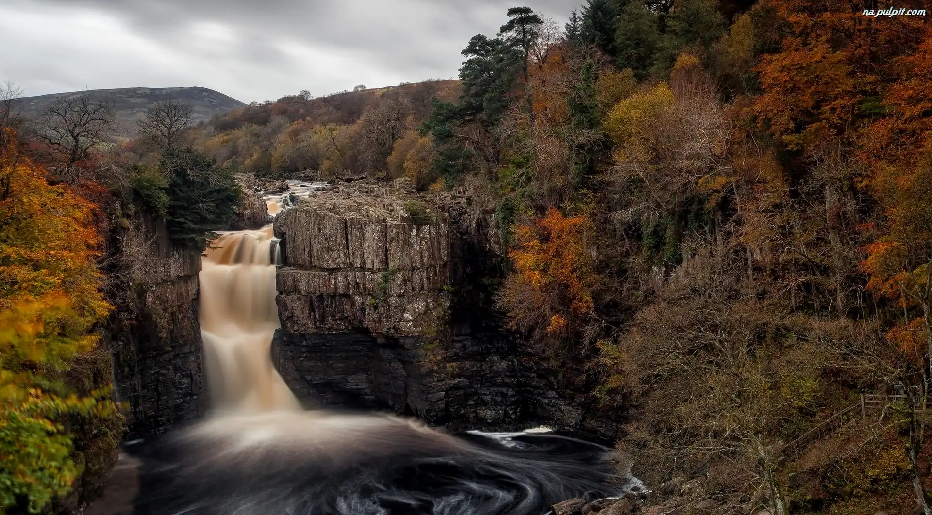 Las, Hrabstwo Durham, Rzeka Tees, Drzewa, Skały, Wodospad High Force, Anglia, Jesień Na Pulpit