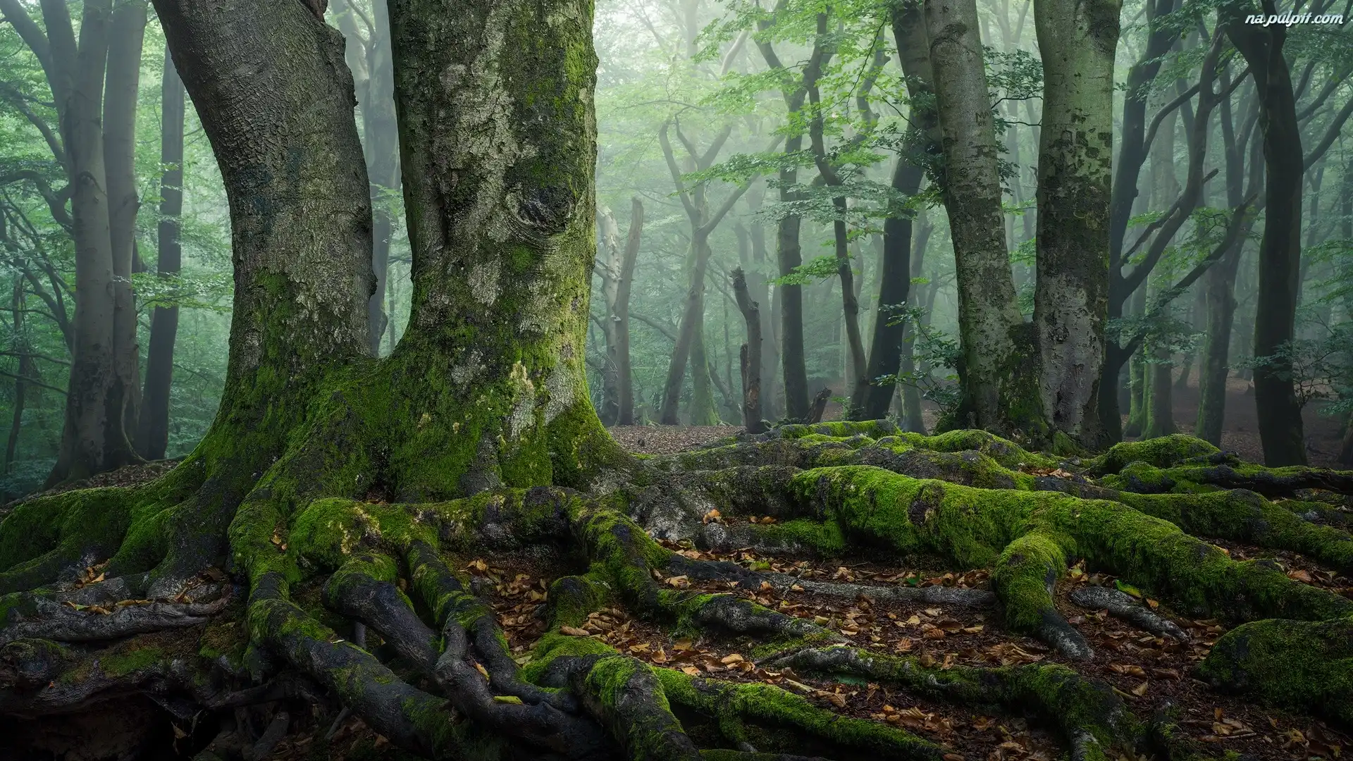 Drzewa, Pnie, Mgła, Korzenie, Las, Omszałe Na Pulpit