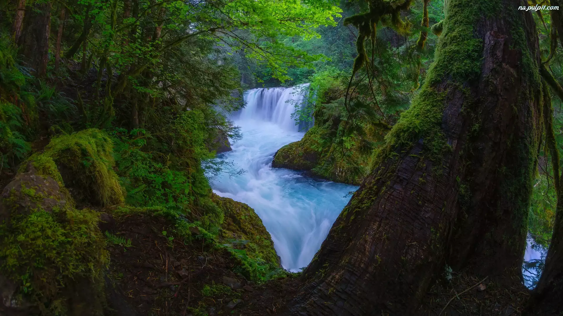 Roślinność, Wodospad, Rzeka, Drzewa, Rwąca, Las
