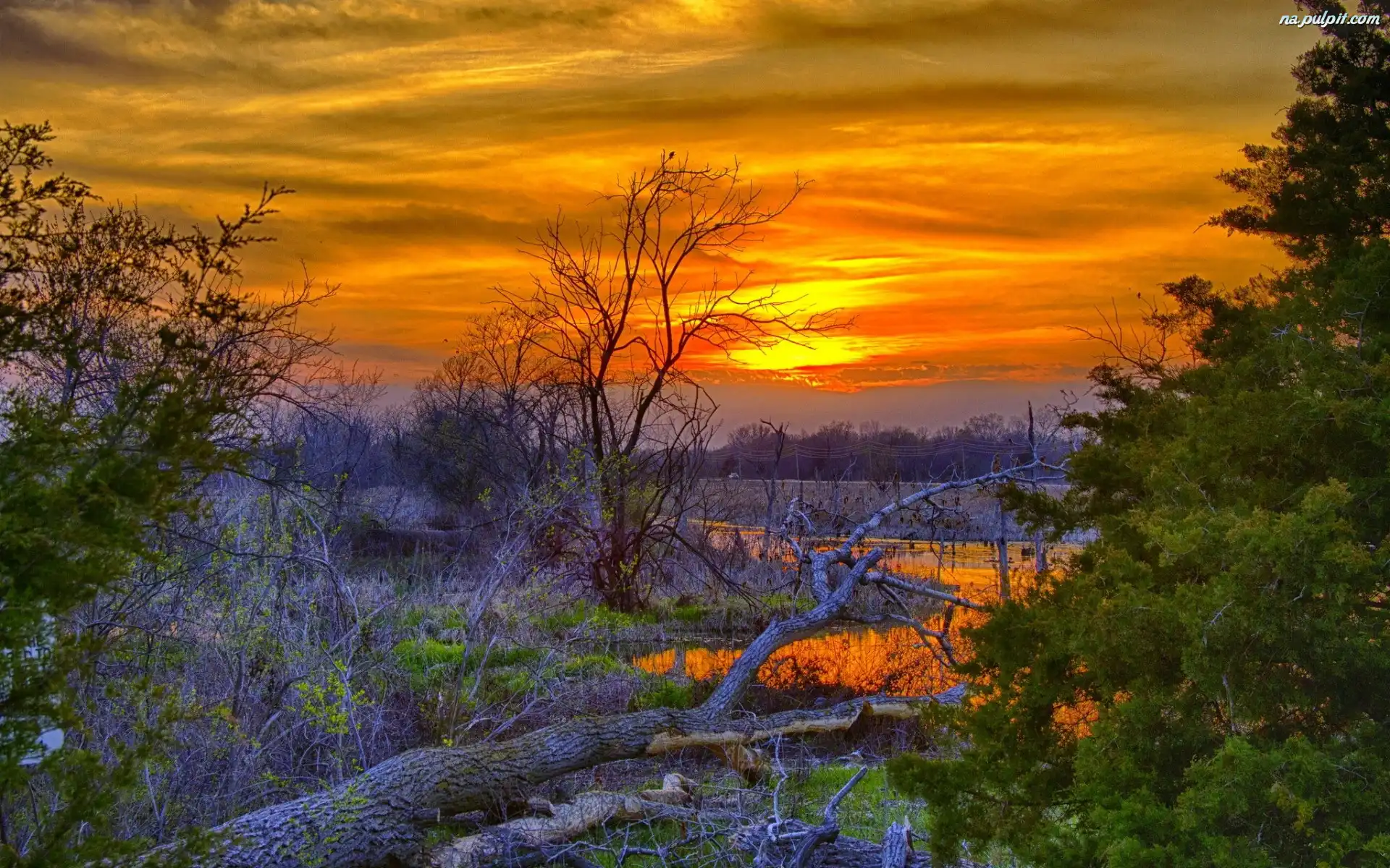 Drzewa, Zachód, Słońca, Konar, Las, Niebo Na Pulpit