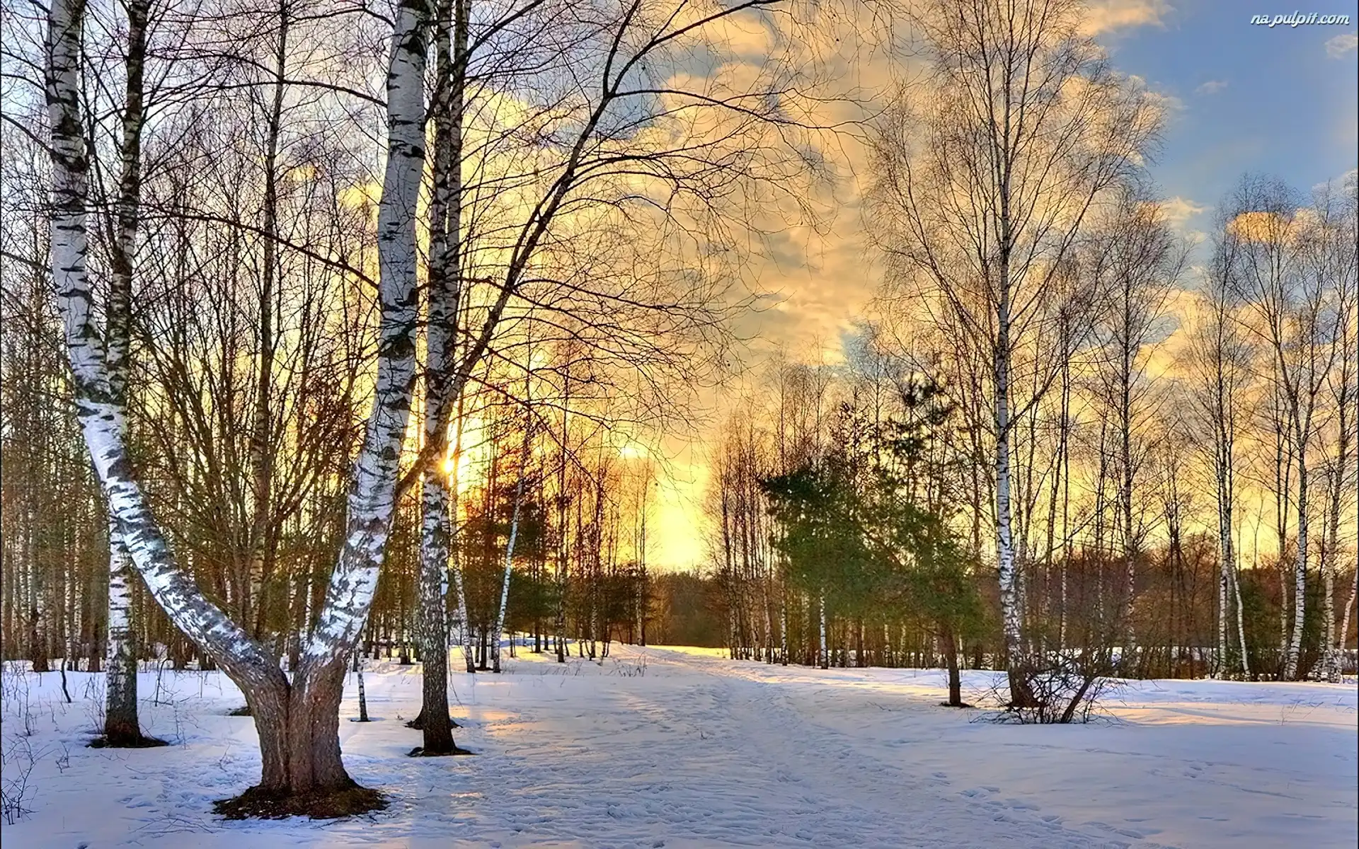 Drzewa, Zachód Słońca, Las, Śnieg Na Pulpit