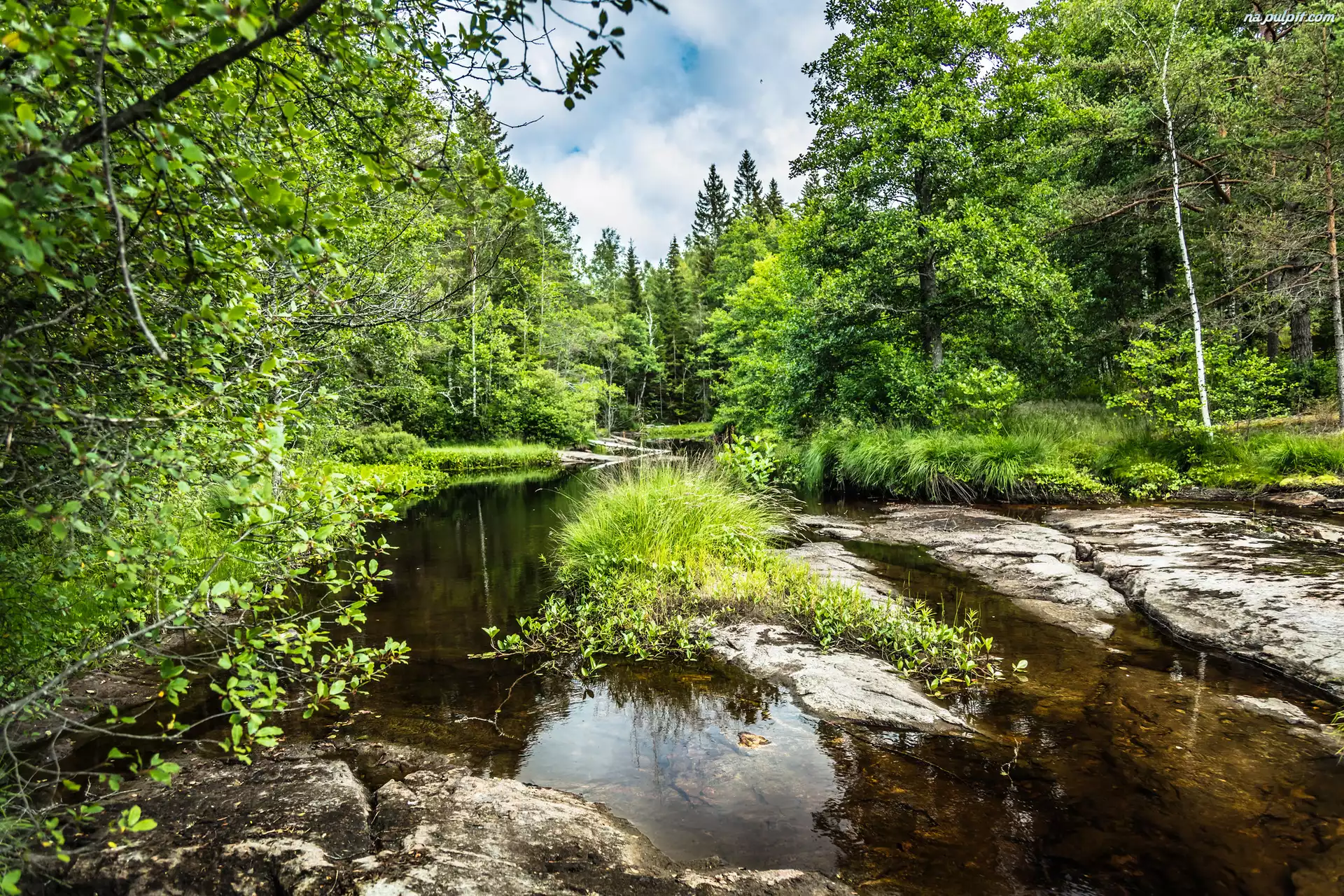 Drzewa, Kępy, Trawa, Rzeka, Las, Kamienie Na Pulpit