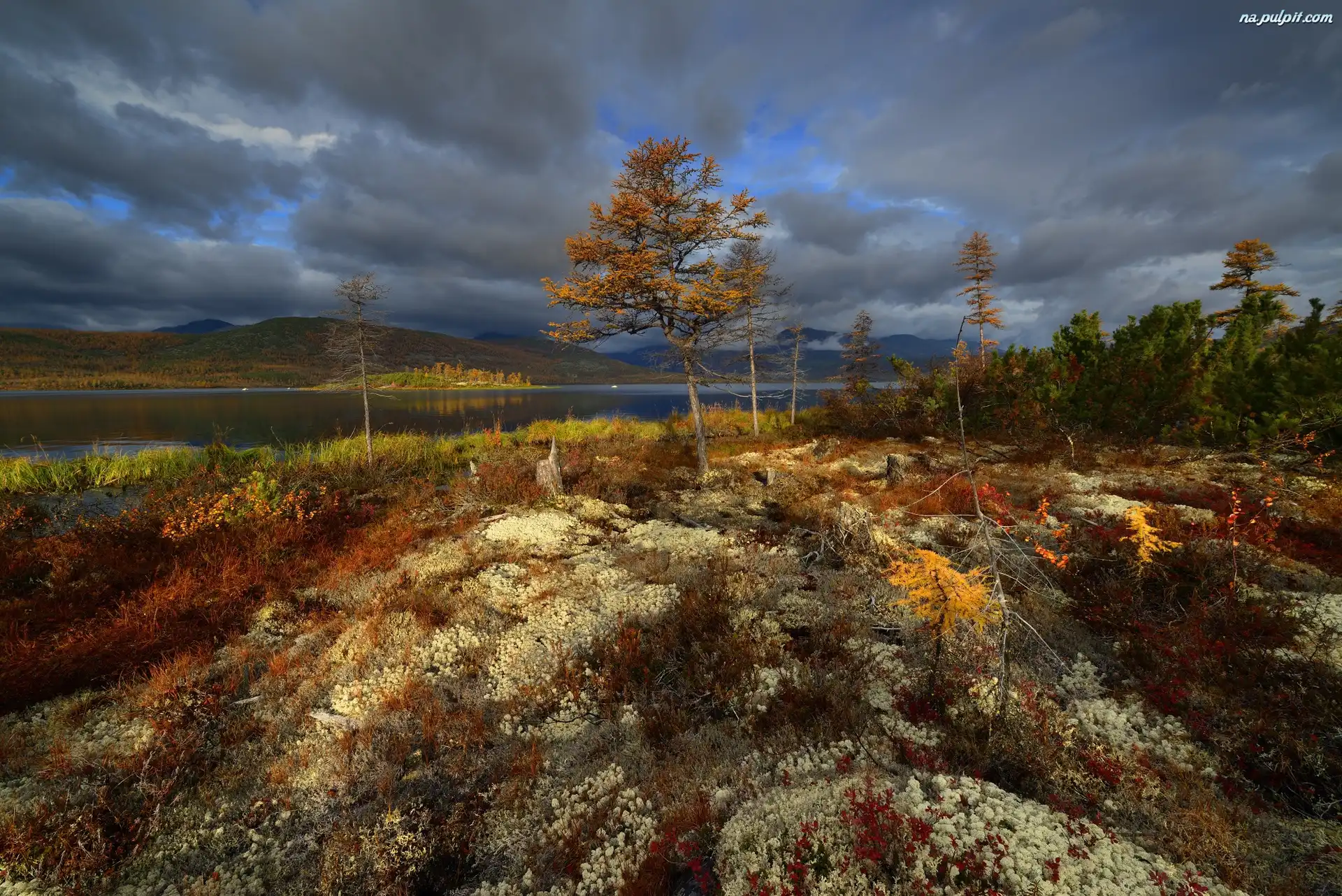 Kołyma, Góry, Drzewa, Obwód magadański, Rosja, Rośliny, Jezioro Jack London, Chmury Na Pulpit