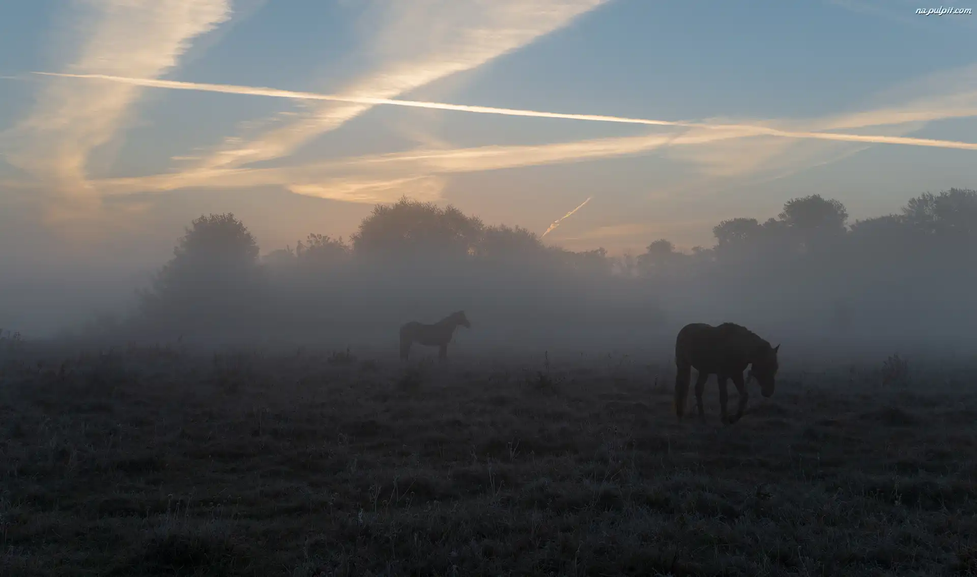 Drzewa, Konie, Mgła, Łąka Na Pulpit