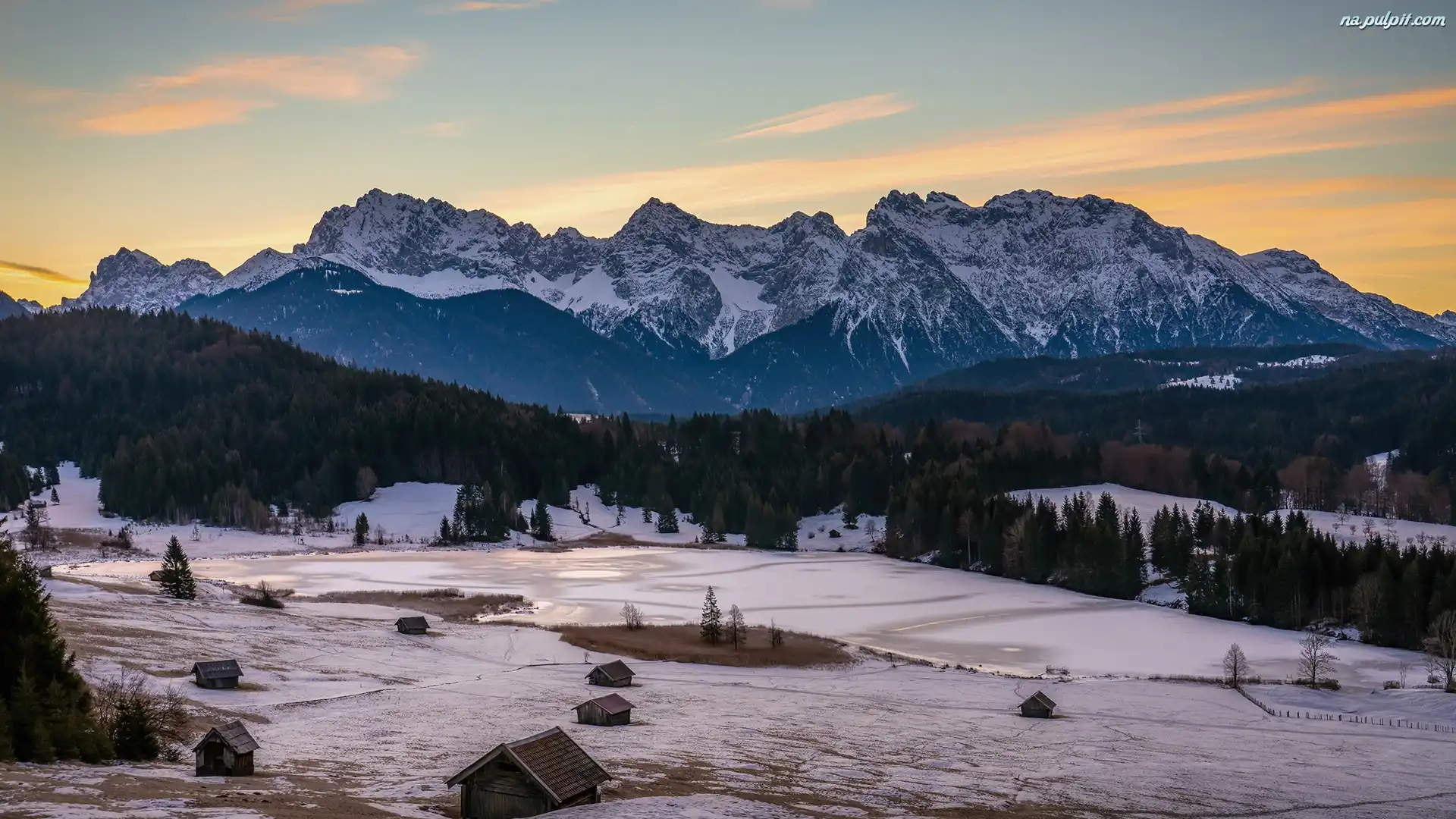 Miejscowość Krun, Jezioro Geroldsee, Las, Drzewa, Bawaria, Niemcy, Domek, Góry Karwendel, Zima Na Pulpit |