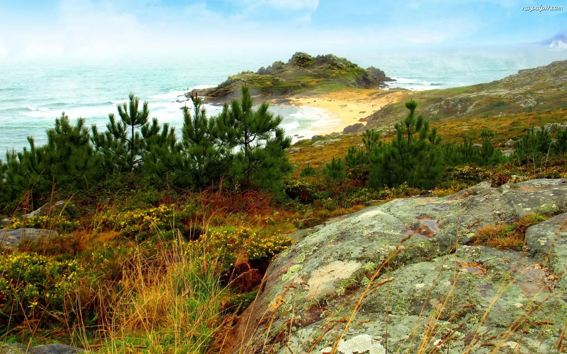 Drzewa, Plaża, Morze, Skała Na Pulpit