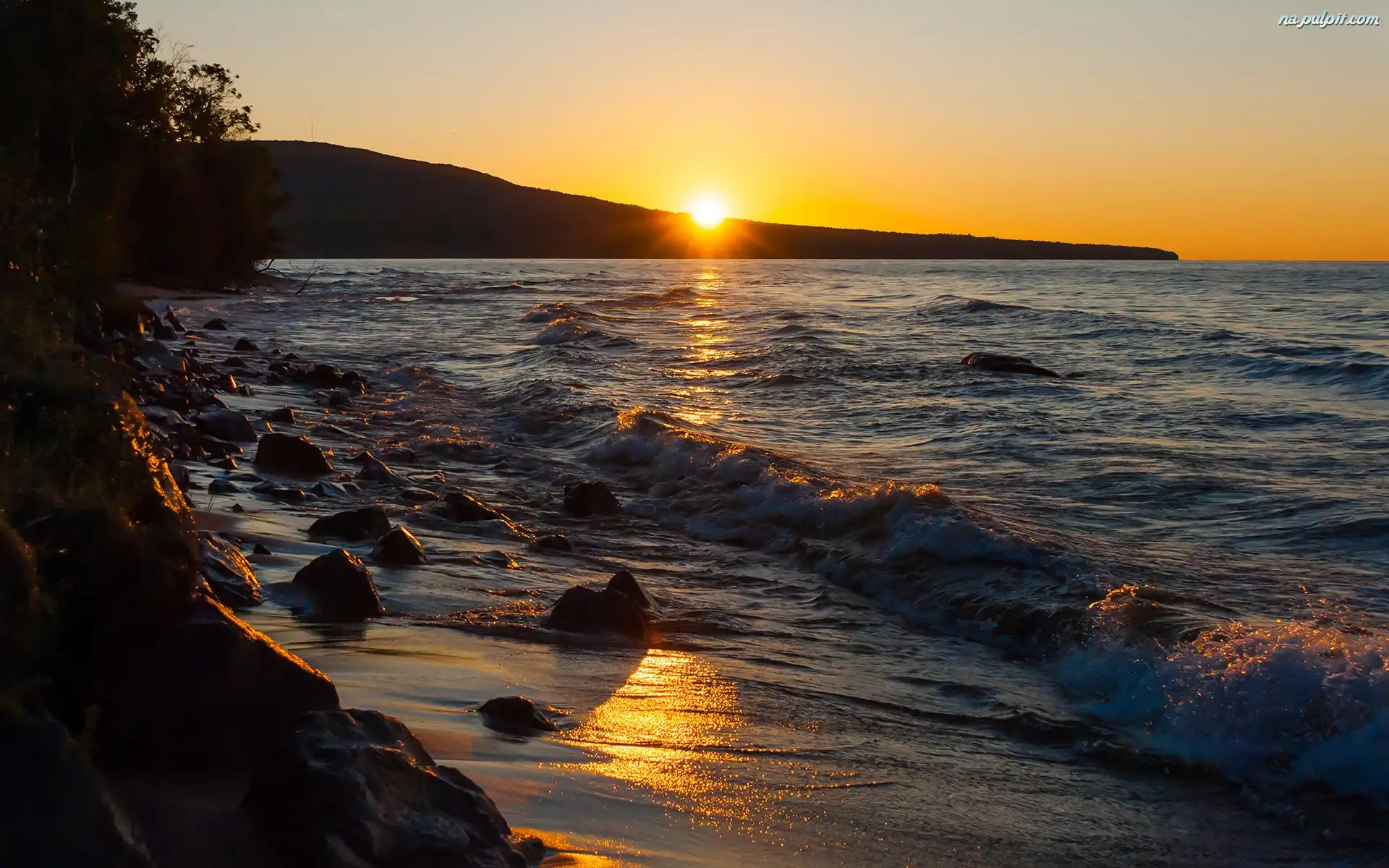 Drzewa, Zachód słońca, Morze, Kamienie Na Pulpit