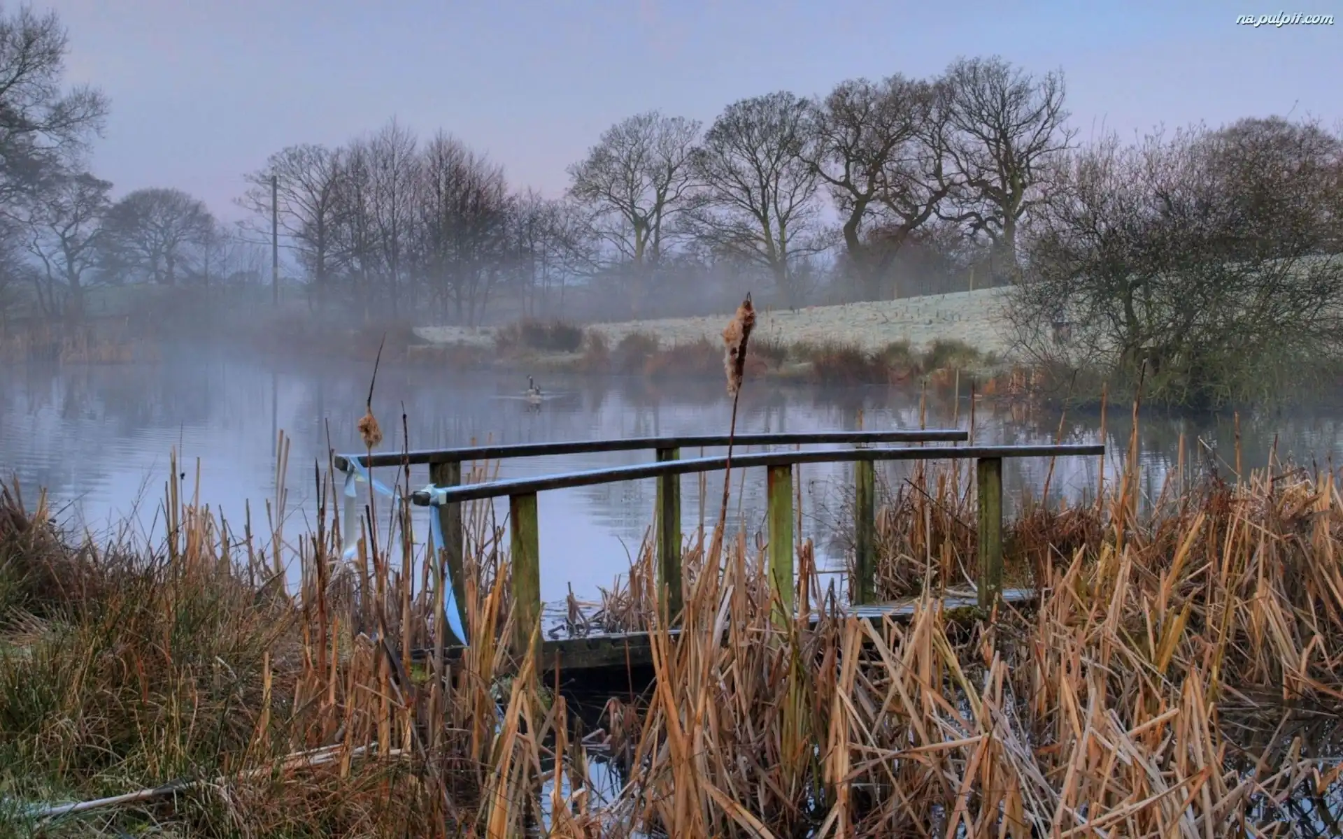 Drzewa, Rzeka, Mostek, Mgła Na Pulpit