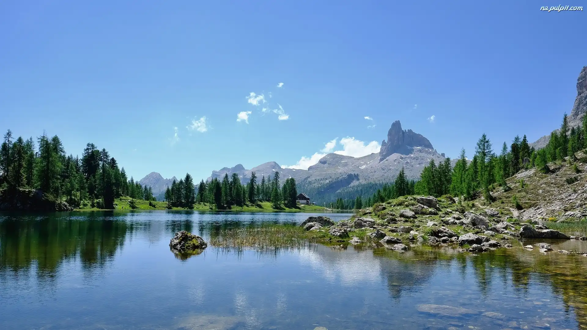 Niebo, Drzewa, Błękitne, Las, Góry, Jezioro, Kamienie Na Pulpit