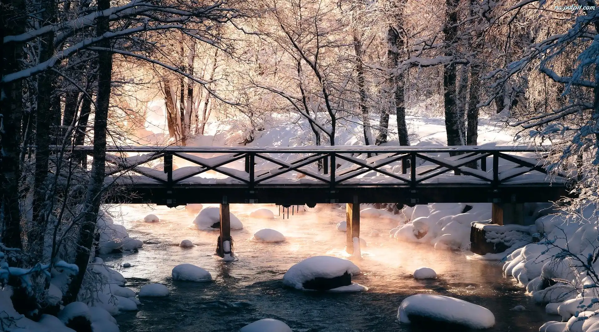Haihunkoski, Rzeka Tarpianjoki, Most, Śnieg, Viiala, Finlandia, Kamienie, Zima, Drzewa Na Pulpit