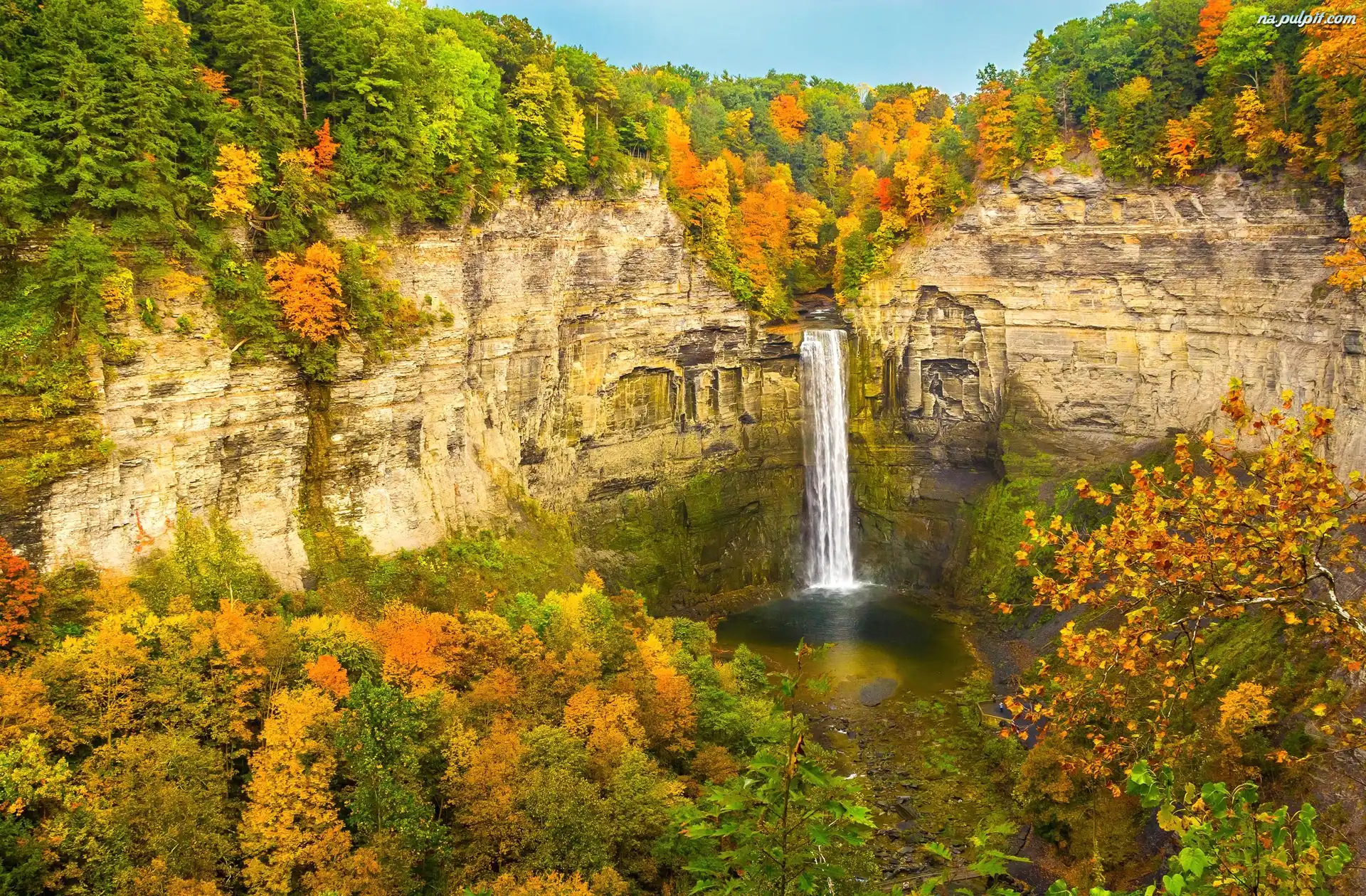 Stany Zjednoczone, Drzewa, Stan Nowy Jork, Taughannock Falls, Wodospad, Jesień, Skały Na Pulpit