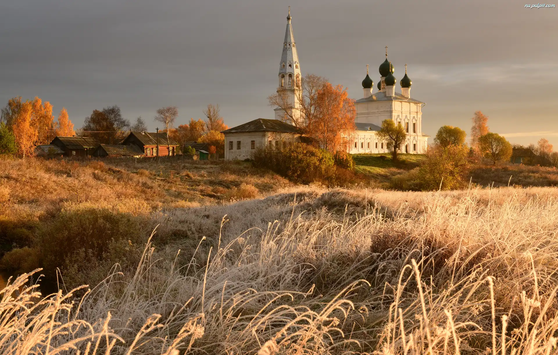 Wieś Osenevo, Oszronione, Trawy, Obwód jarosławski, Rosja, Jesienne, Cerkiew, Drzewa Na Pulpit