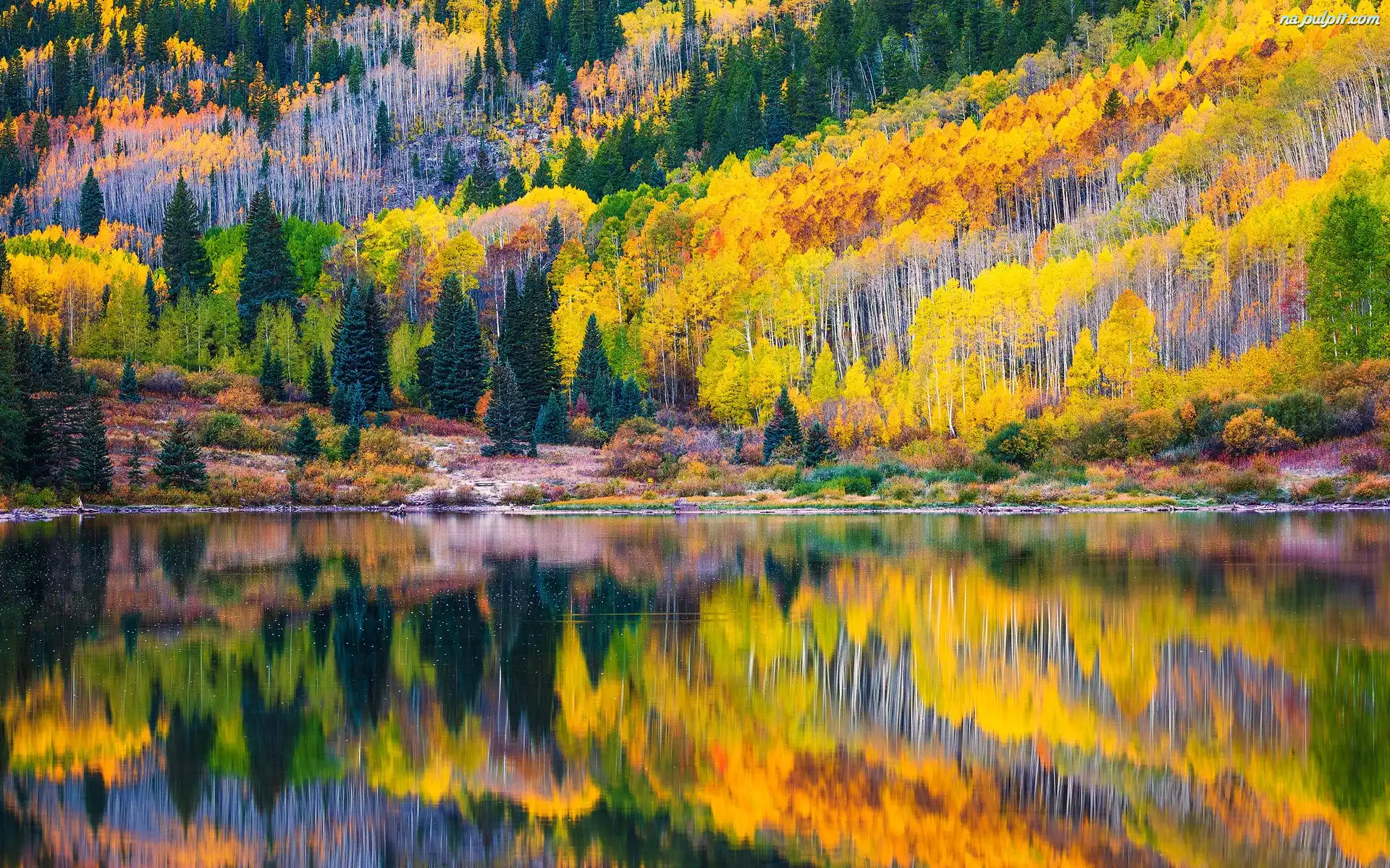 Jesień, Jezioro, Pożółkłe, Drzewa, Las, Odbicie Na Pulpit