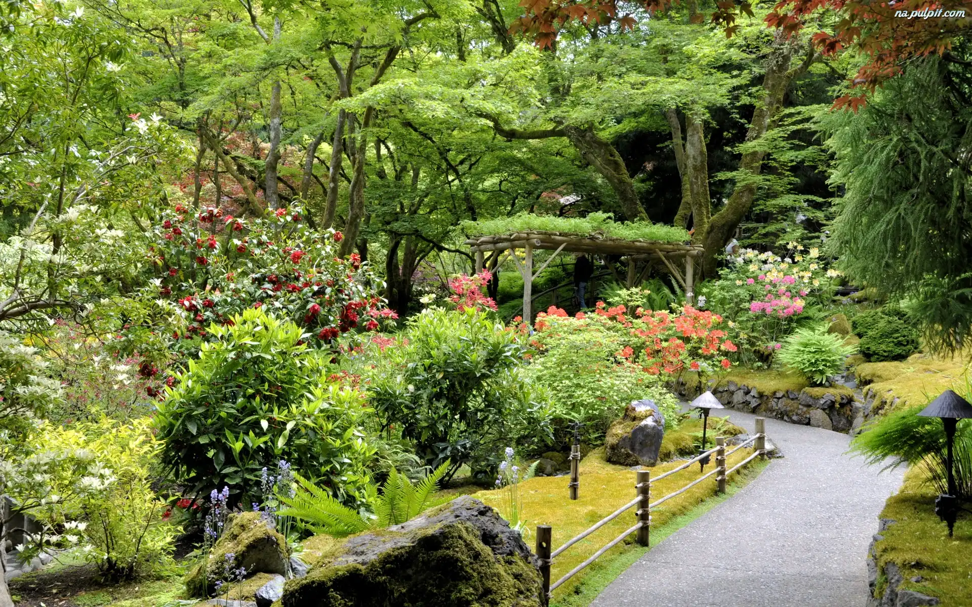 Ogród, Japoński Drzewa, Japonia, Dom Gitary, Wysepka, Kształt Kwiaty, Żółte, Ogród, Liliowe ludzie, Drzewo, Lato, Góry, Krzew Rower, Pole Nad morzem, Zachód, Słońce Plantacja, Bananów Hawaje, Tropikalna, Laguna Róże, Ogród Roślinność, Basen, Fontanna Rośliny, Ogród, Zielone Ławka, Lasek, Dróżka Ogród, Azalie, Różowe, Japoński