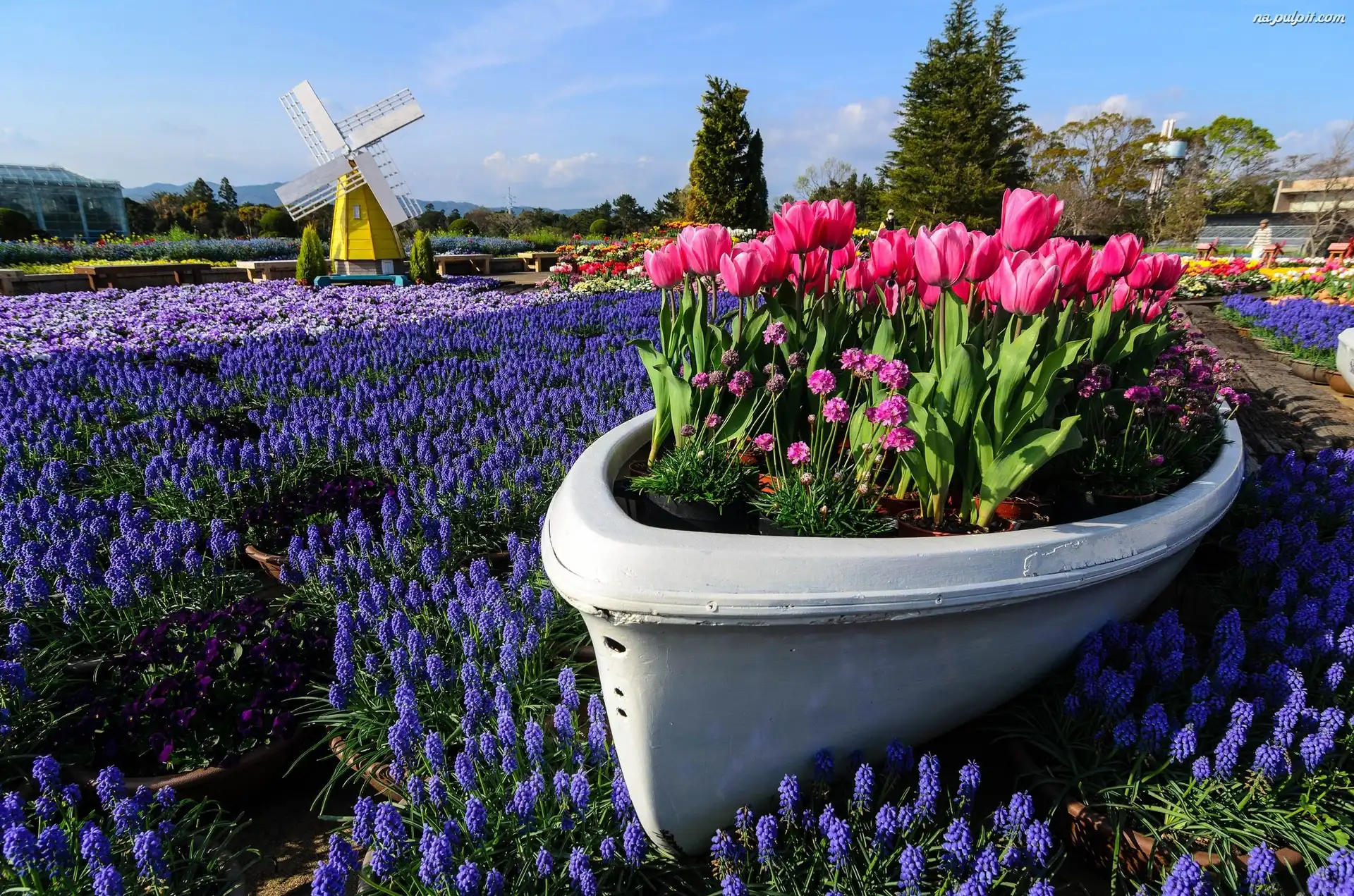 Drzewa, Szafirki, Tulipany, Ogród, Wiatrak