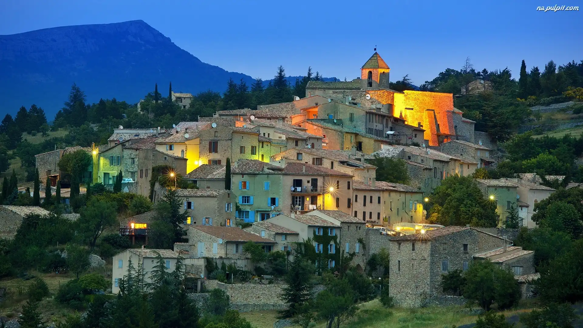 Drzewa, Domy, Oświetlone, Góry Na Pulpit