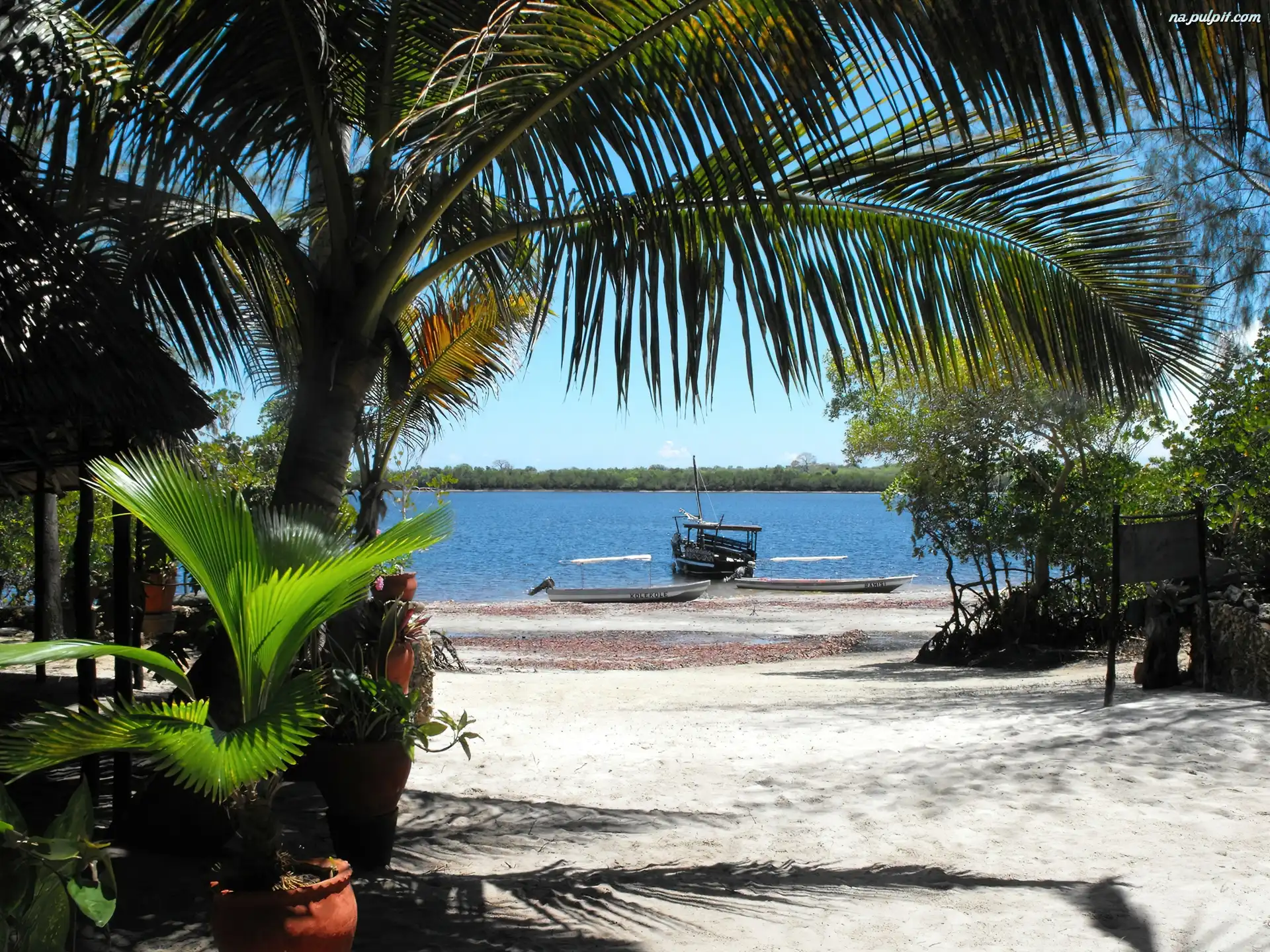 Drzewa, Plaża, Rzeka, Palma, Łodzie