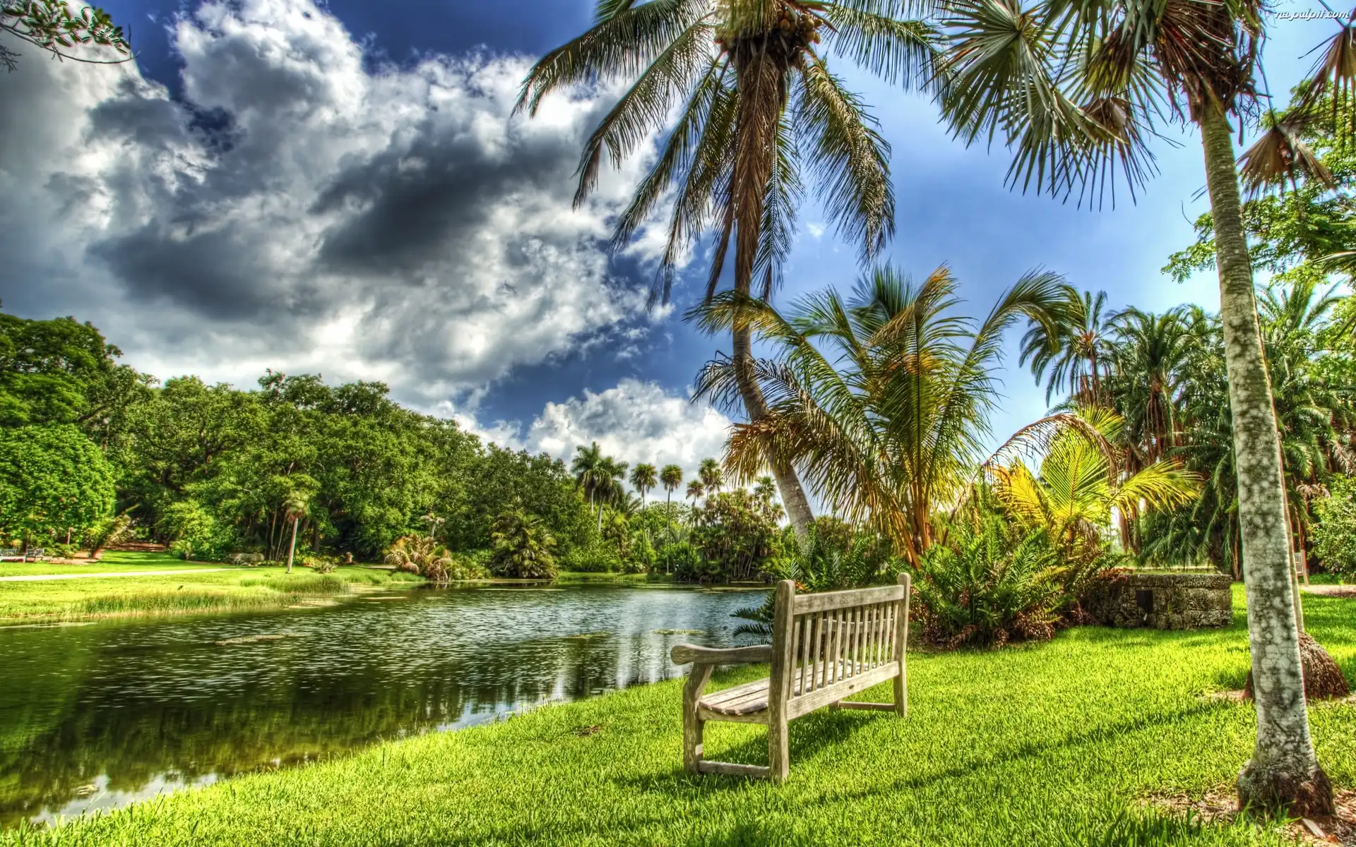 Drzewa, Rzeka, Palmy, Ławka Na Pulpit