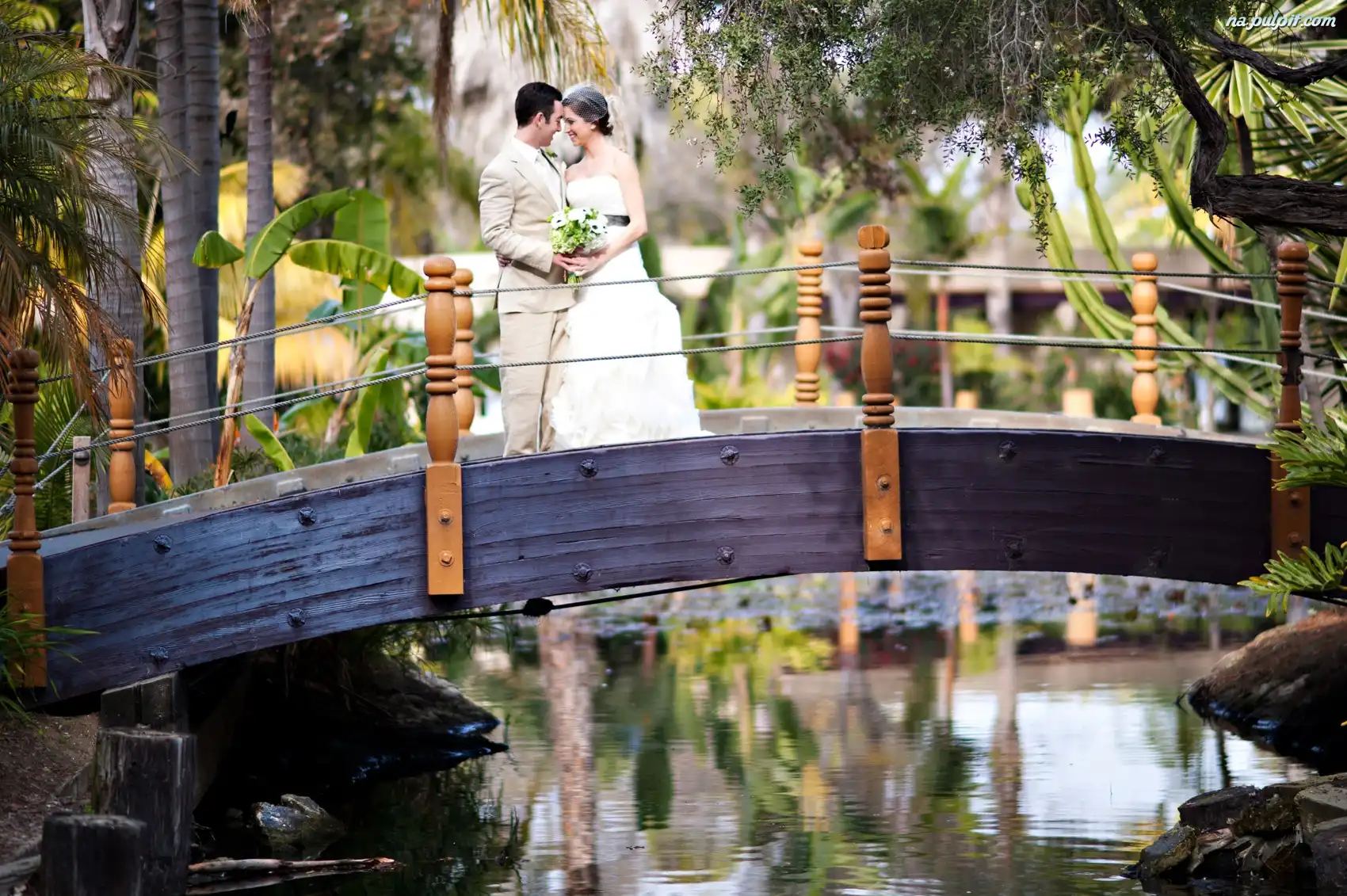 Drzewa, Mostek, Młodych, Para, Woda Na Pulpit