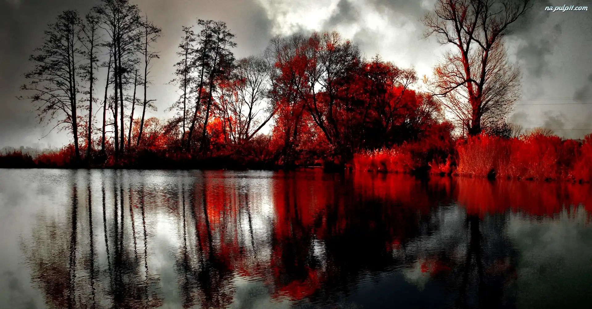 Drzewa, Chmury, Jezioro, Park, Kolorowe