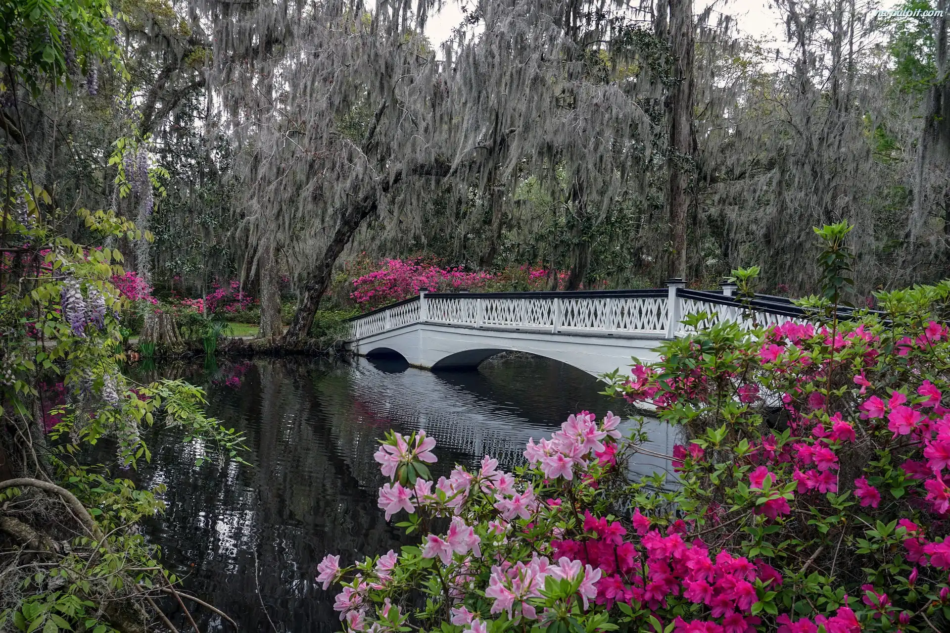 Drzewa, Mostek, Rzeka, Park, Azalie Na Pulpit