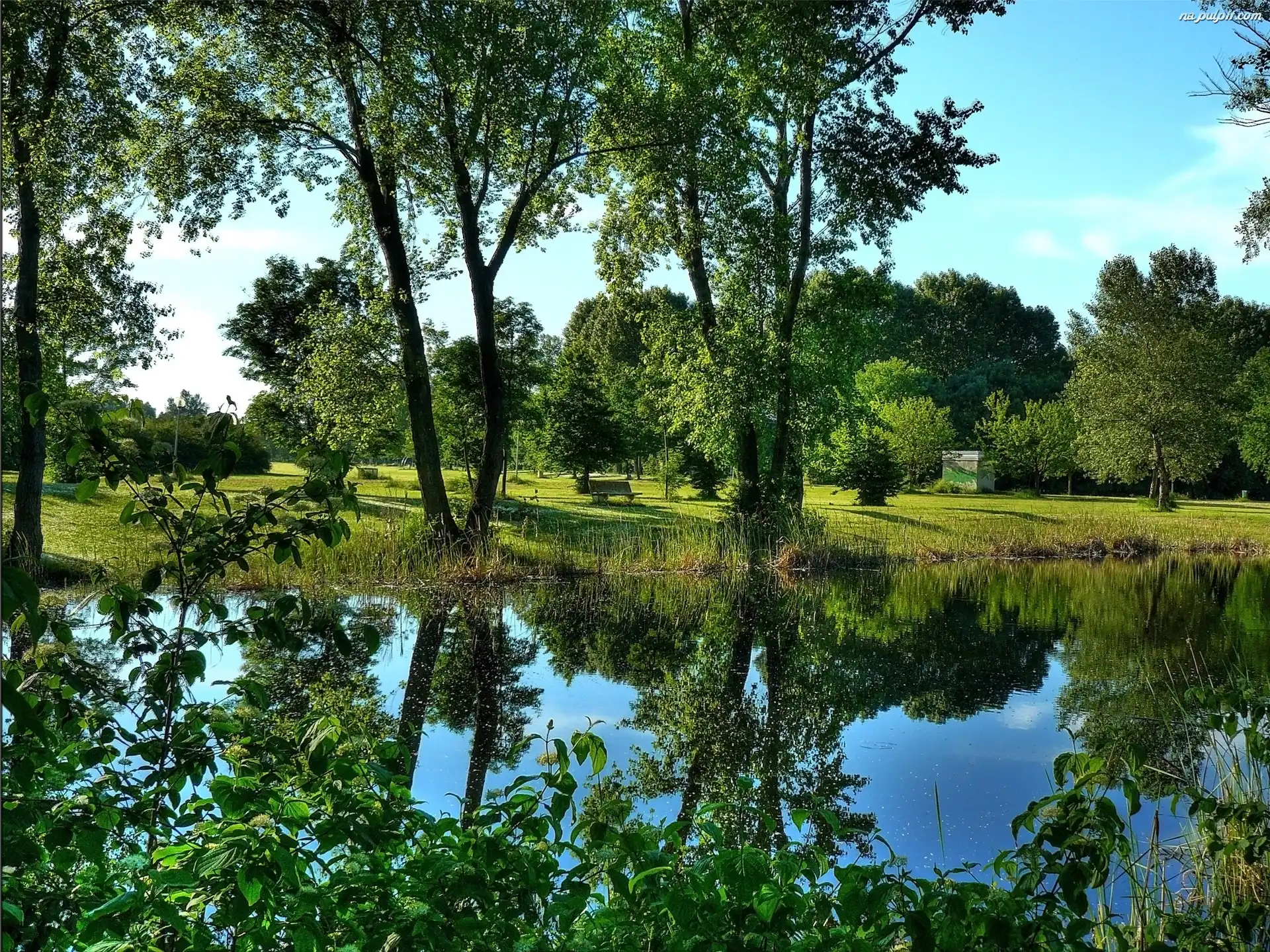 Drzewa, Staw, Park, Roślinność Na Pulpit