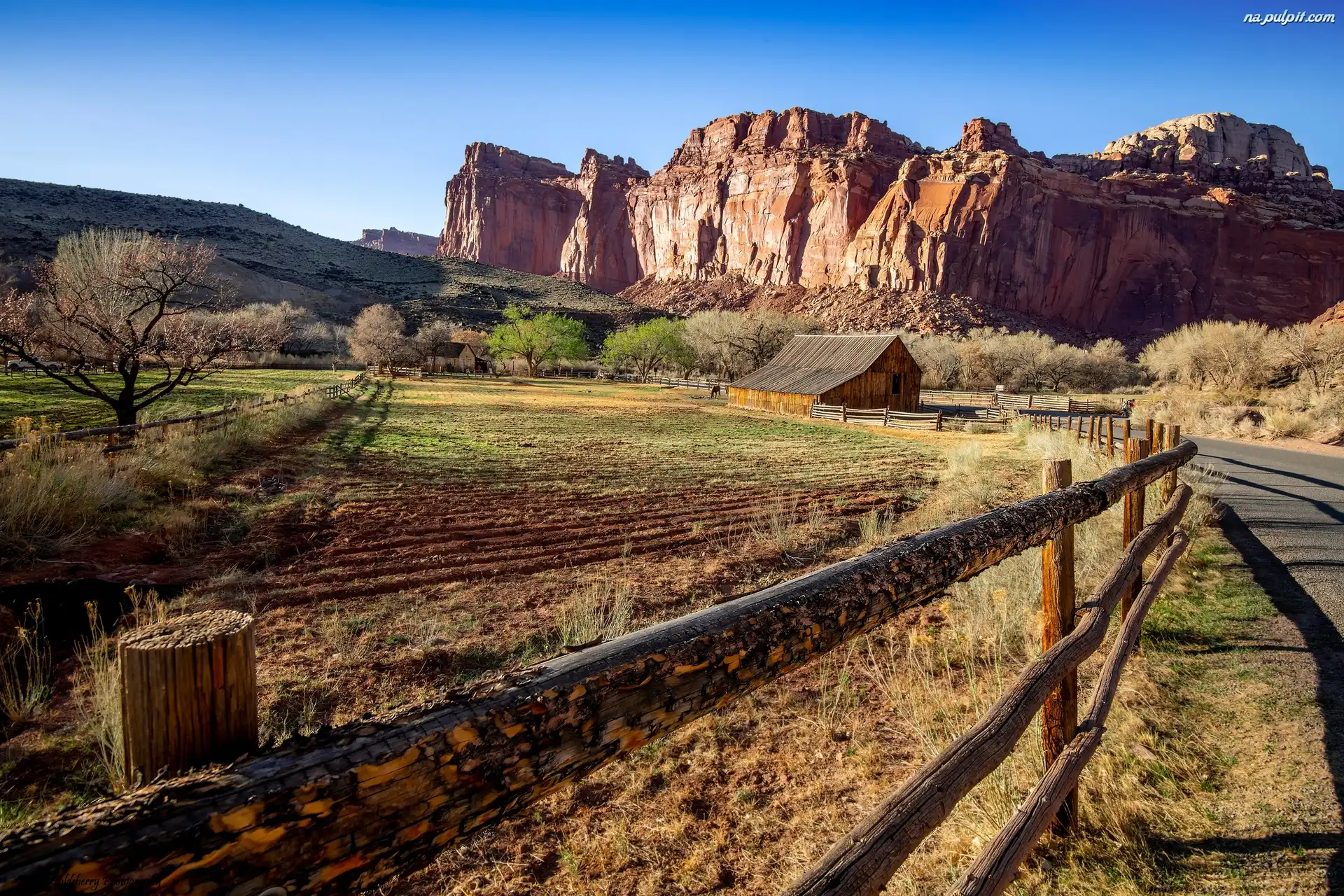 Utah, Stodoła Gifford, Stany Zjednoczone, Skały, Ogrodzenie, Drzewa, Czerwone, Droga, Pola, Park Narodowy Capitol Reef Na Pulpit |
