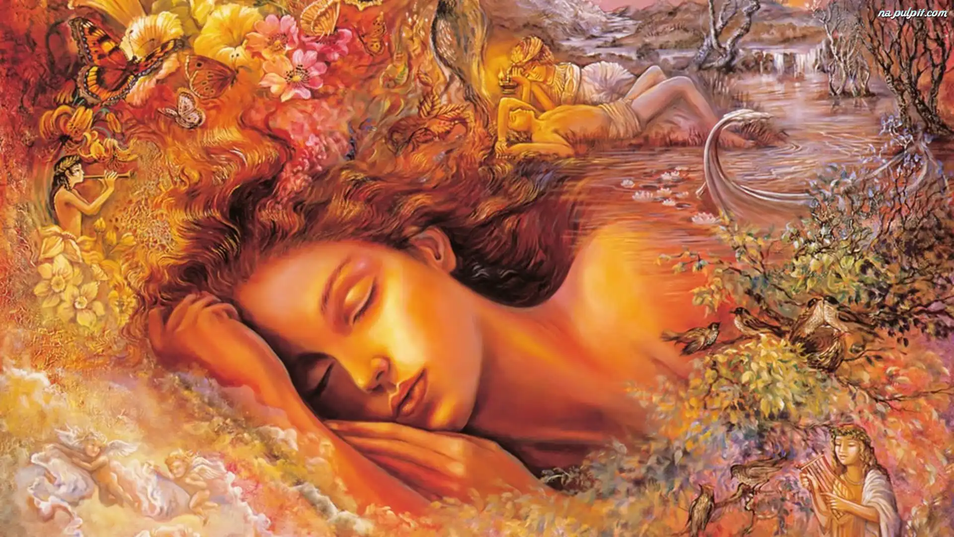 Dziewczyna, Drzewa, Josephine Wall, Woda, ÅšpiÄ…ca, Kwiaty