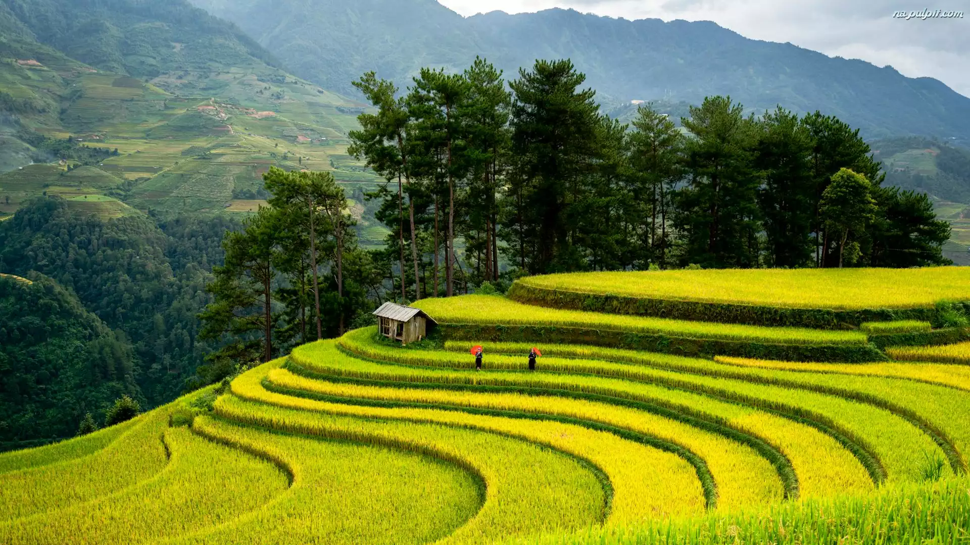 Drzewa, Drewniana, Tarasy ryżowe, Wzgórza, Góry, Pola uprawne, Szopa Na Pulpit
