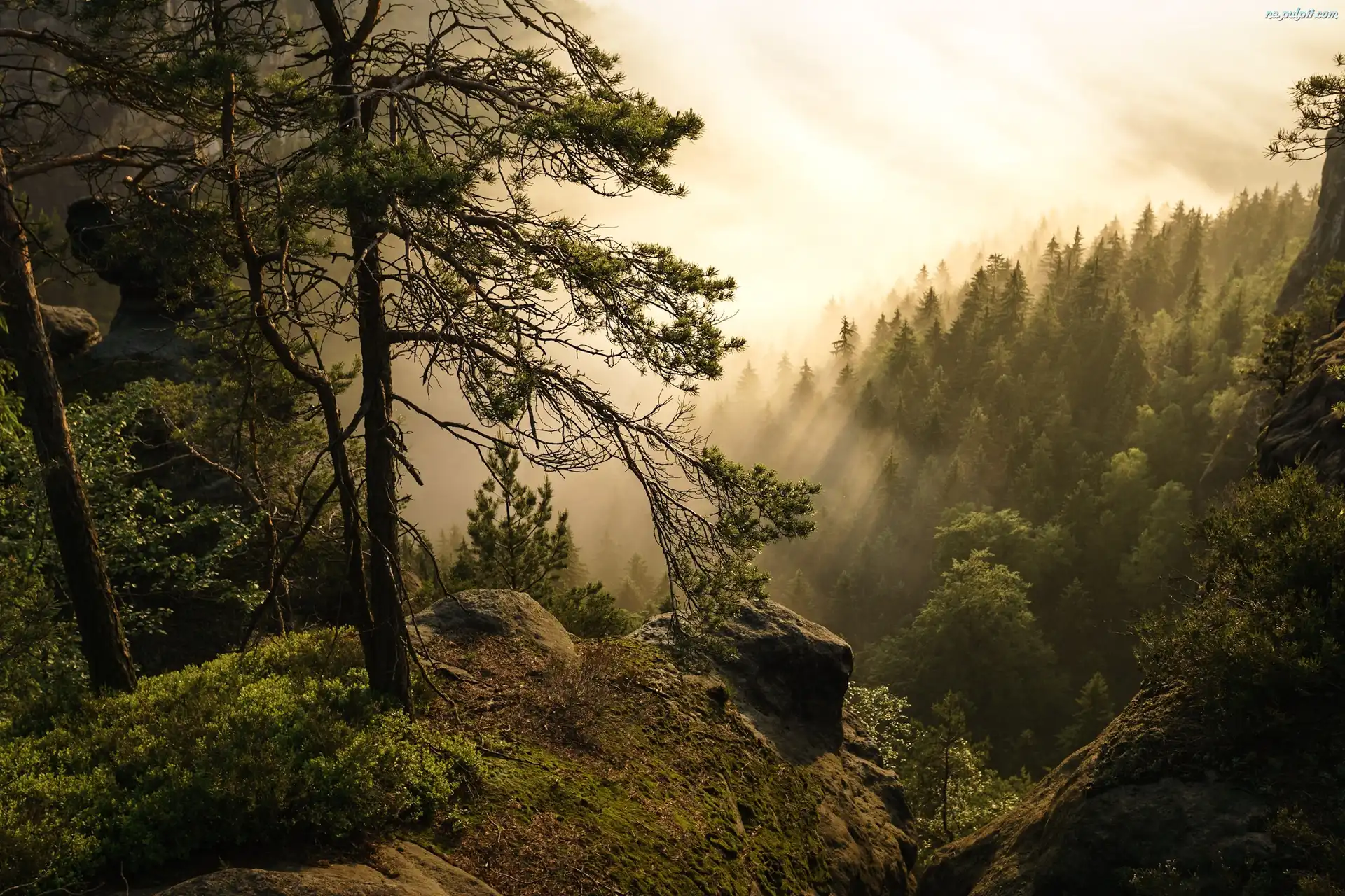 Mgła, Góry Połabskie, Park Narodowy Saskiej Szwajcarii, Niemcy, Drzewa