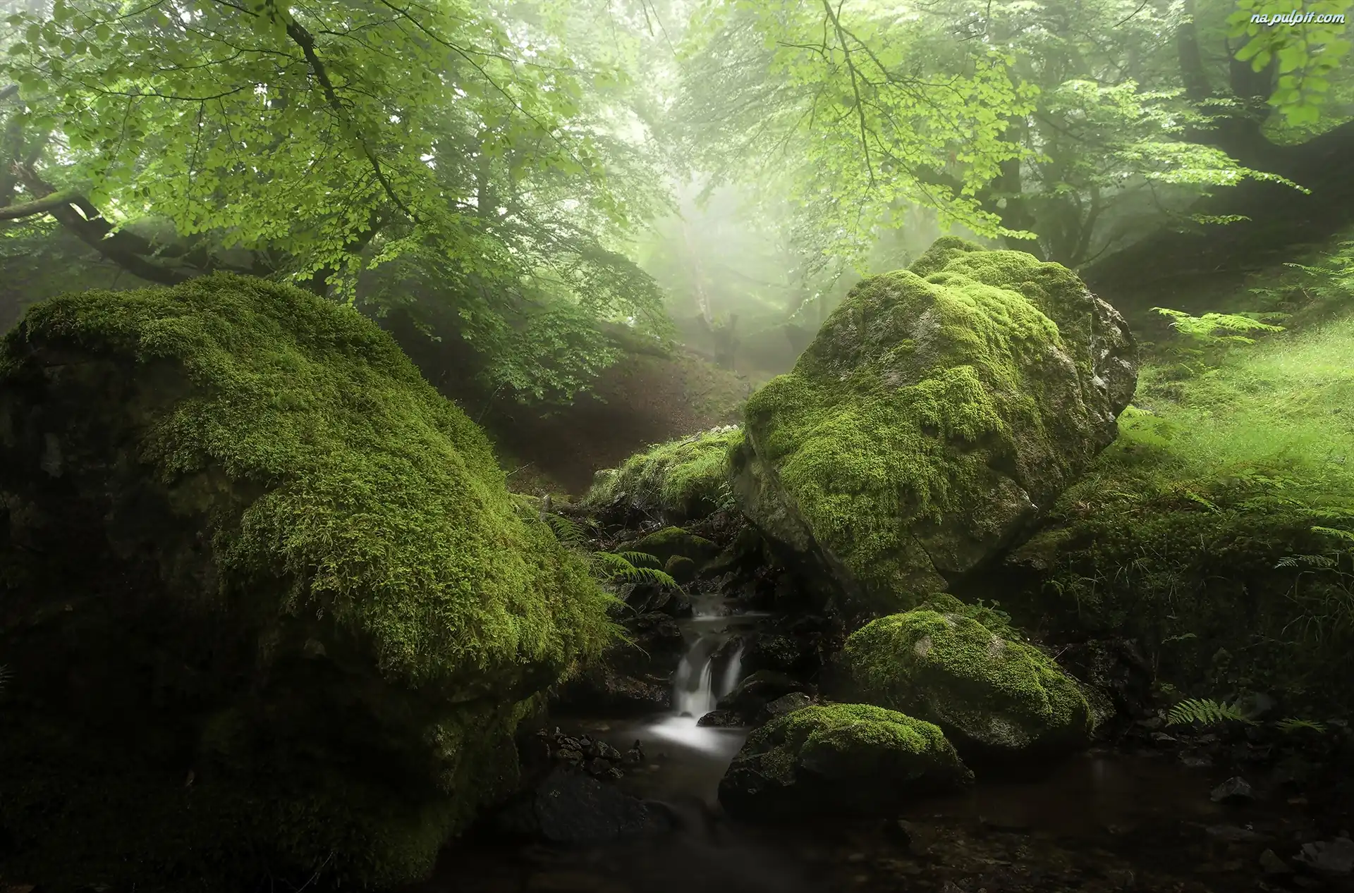 Drzewa, Skały, Omszałe, Potok, Mgła Na Pulpit