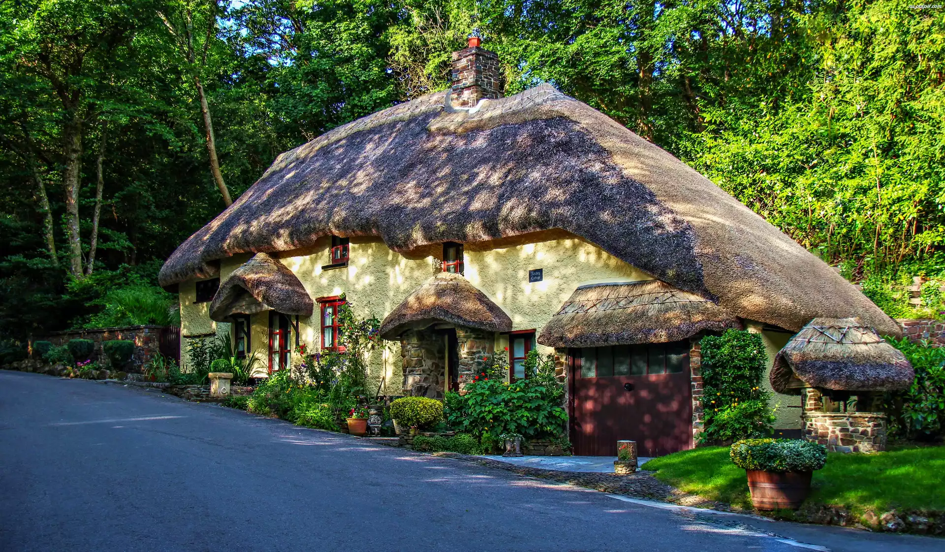 Drzewa, Dom, Droga, Anglia, Przebijające światło