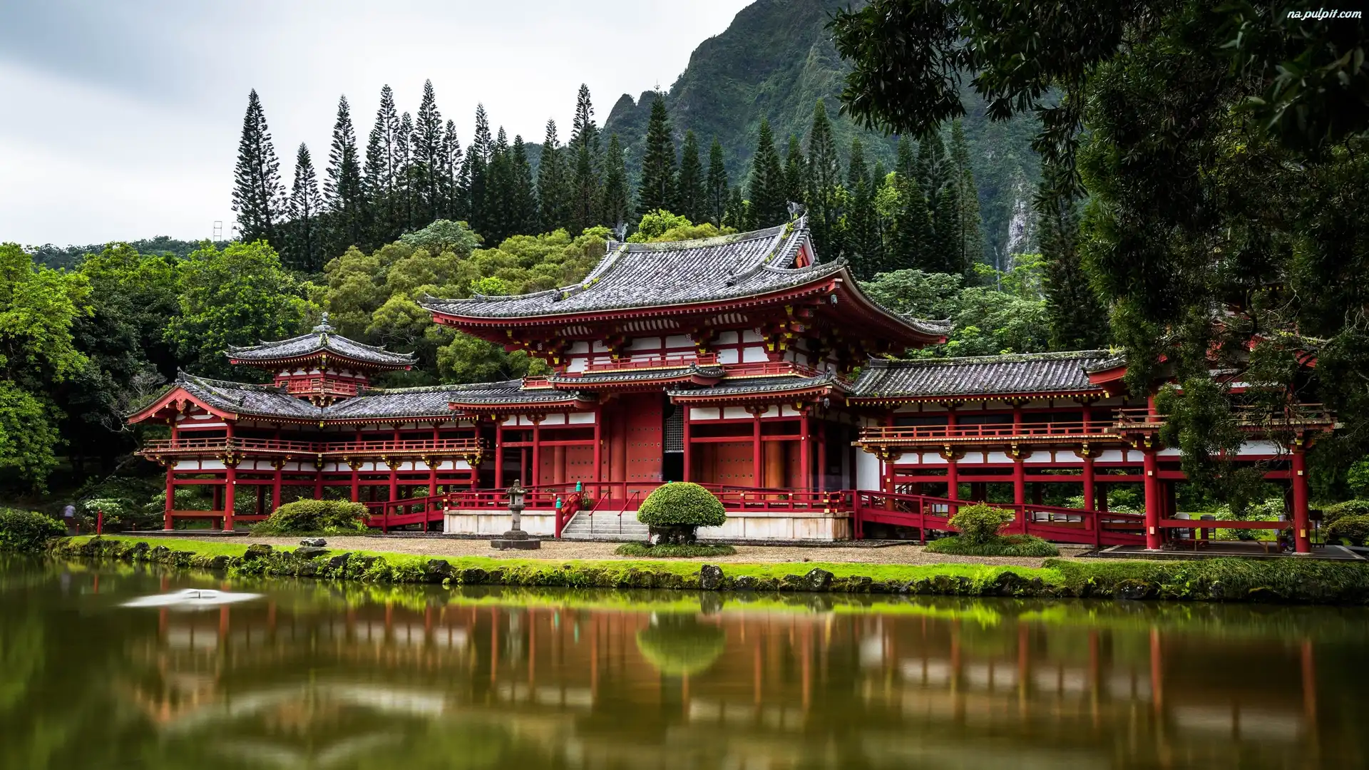 Replika, Hawaje, Wyspa Oahu, Budowla, Drzewa, Góry, Świątynia, Stany Zjednoczone, Byodo-In Na Pulpit |