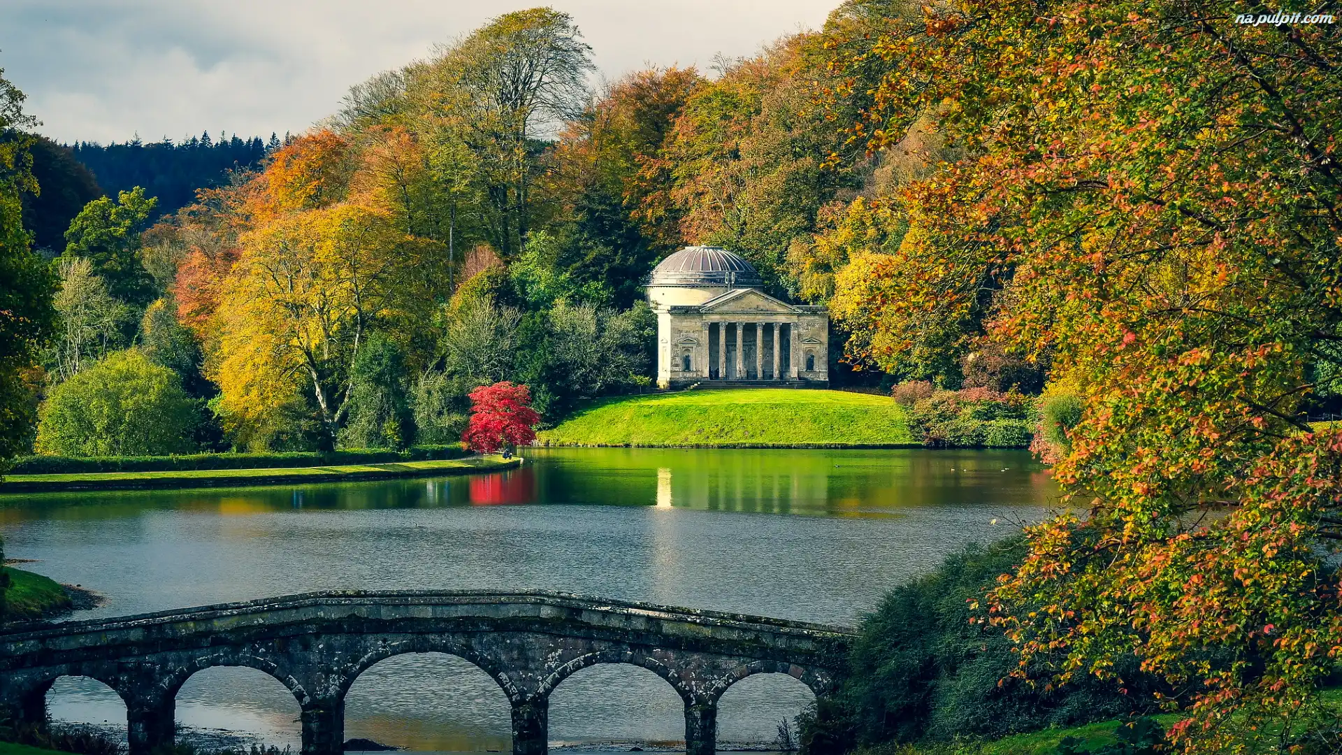 Jezioro, Panteon, Drzewa, Most, Rezydencja Stourhead, Wiltshire, Anglia, Budowla, Jesień, Ogród Na Pulpit |
