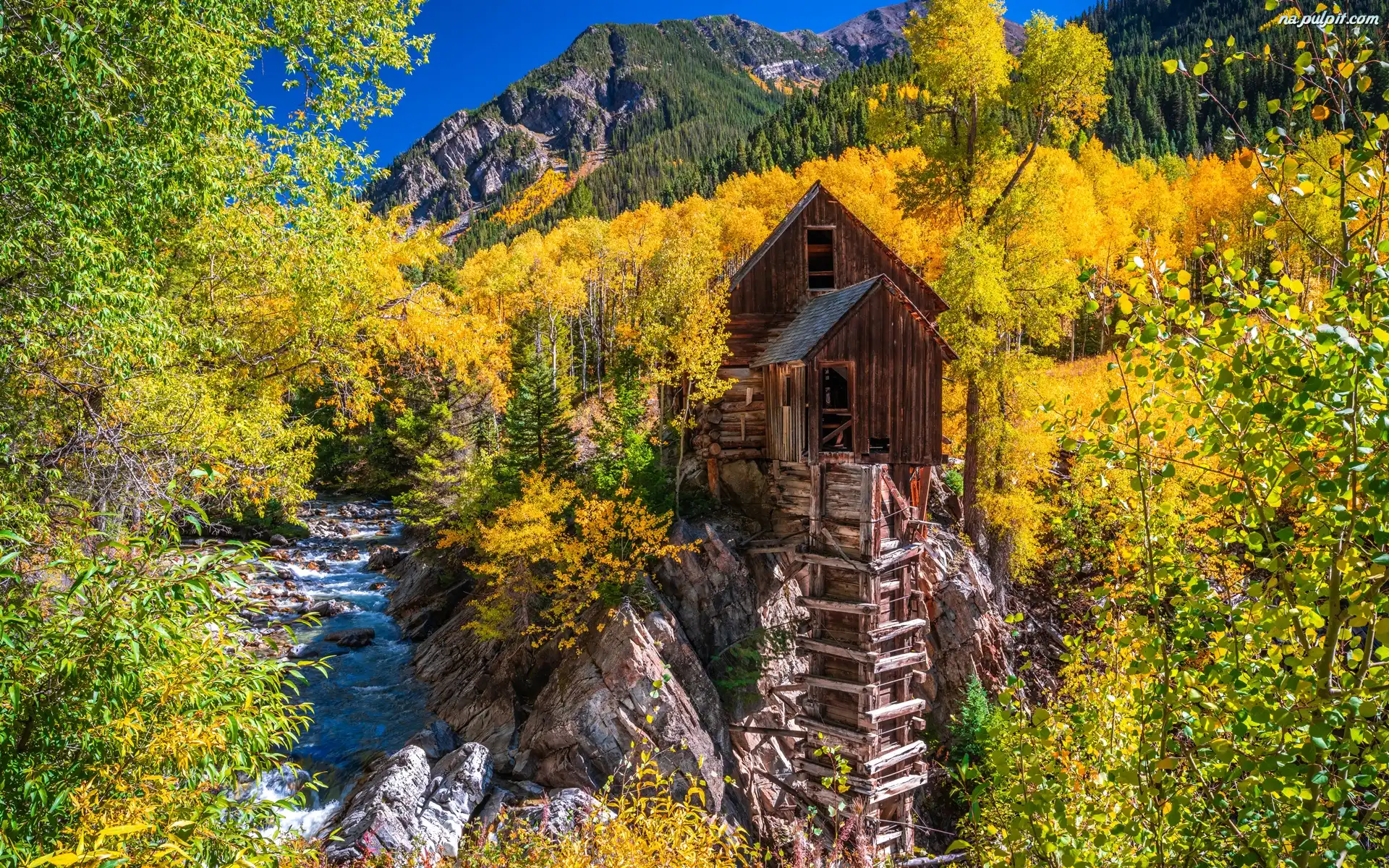 Drzewa, Rzeka Crystal River, Góry, Kolorado, Stany Zjednoczone, Jesień, Młyn Crystal Mill, Skały Na Pulpit |