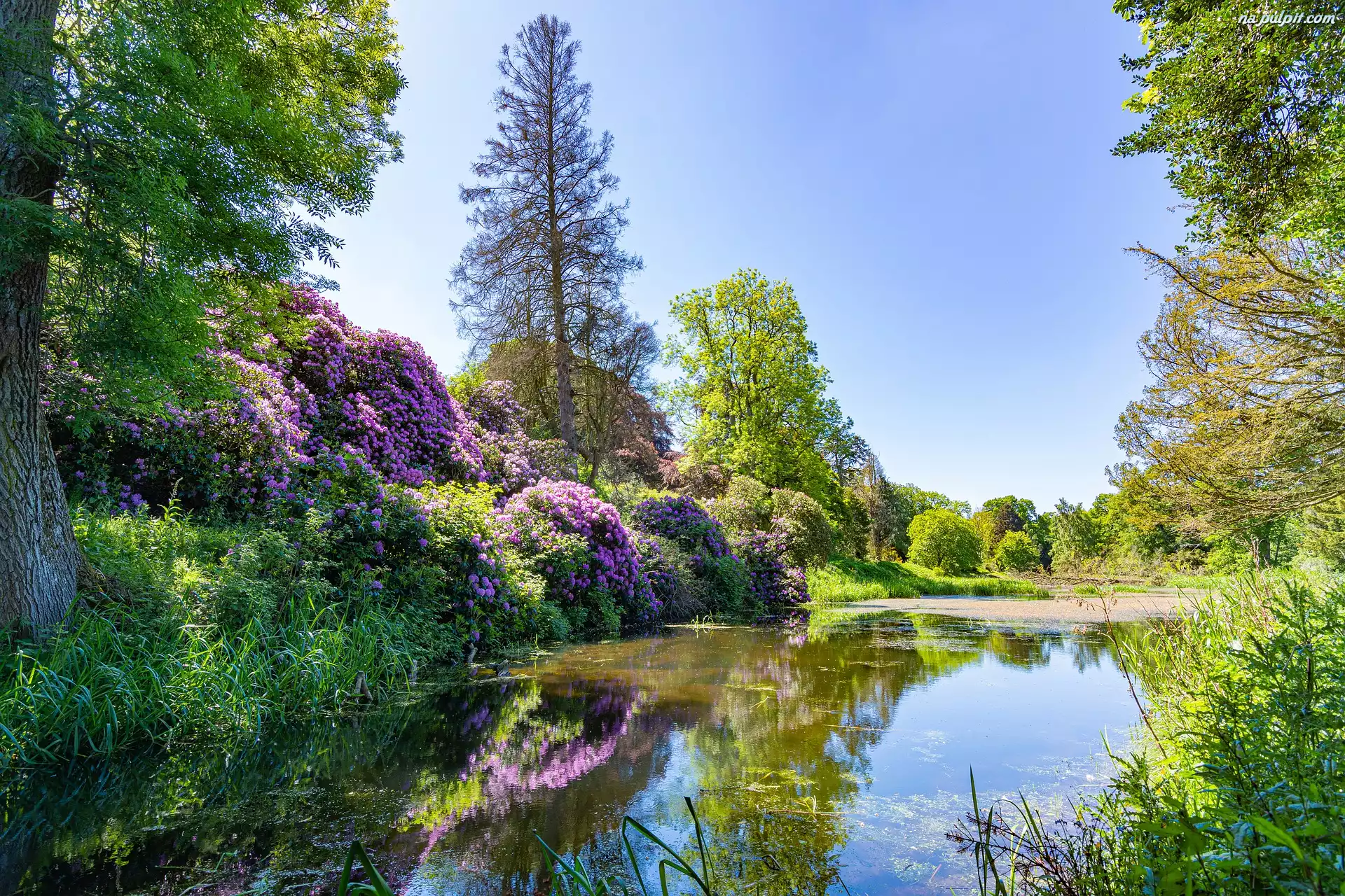 Staw, Drzewa, Rododendrony, Słoneczny dzień Na Pulpit