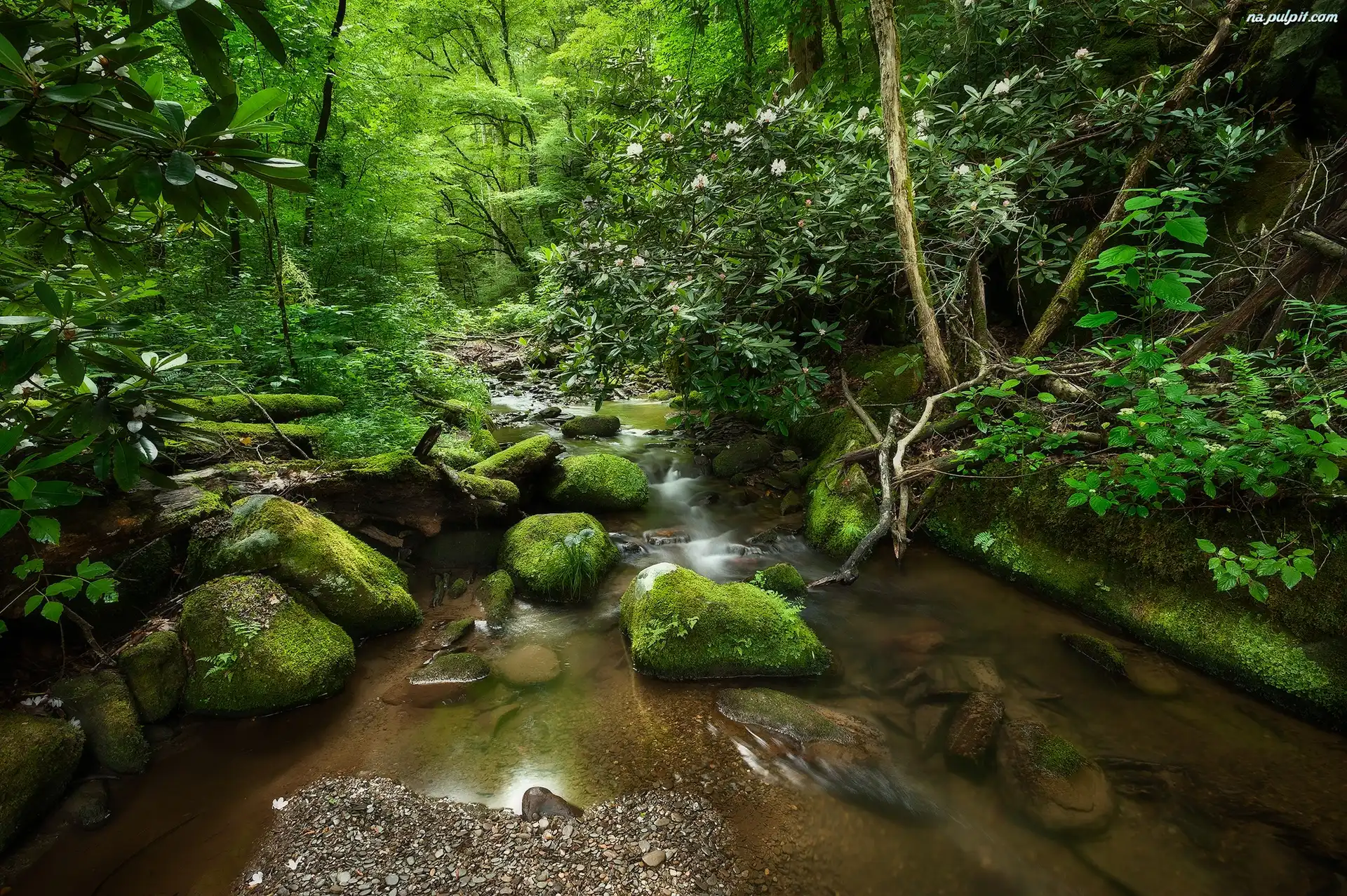 Różanecznik, Drzewa, Krzewy, Omszone, Potok, Las, Kamienie Na Pulpit