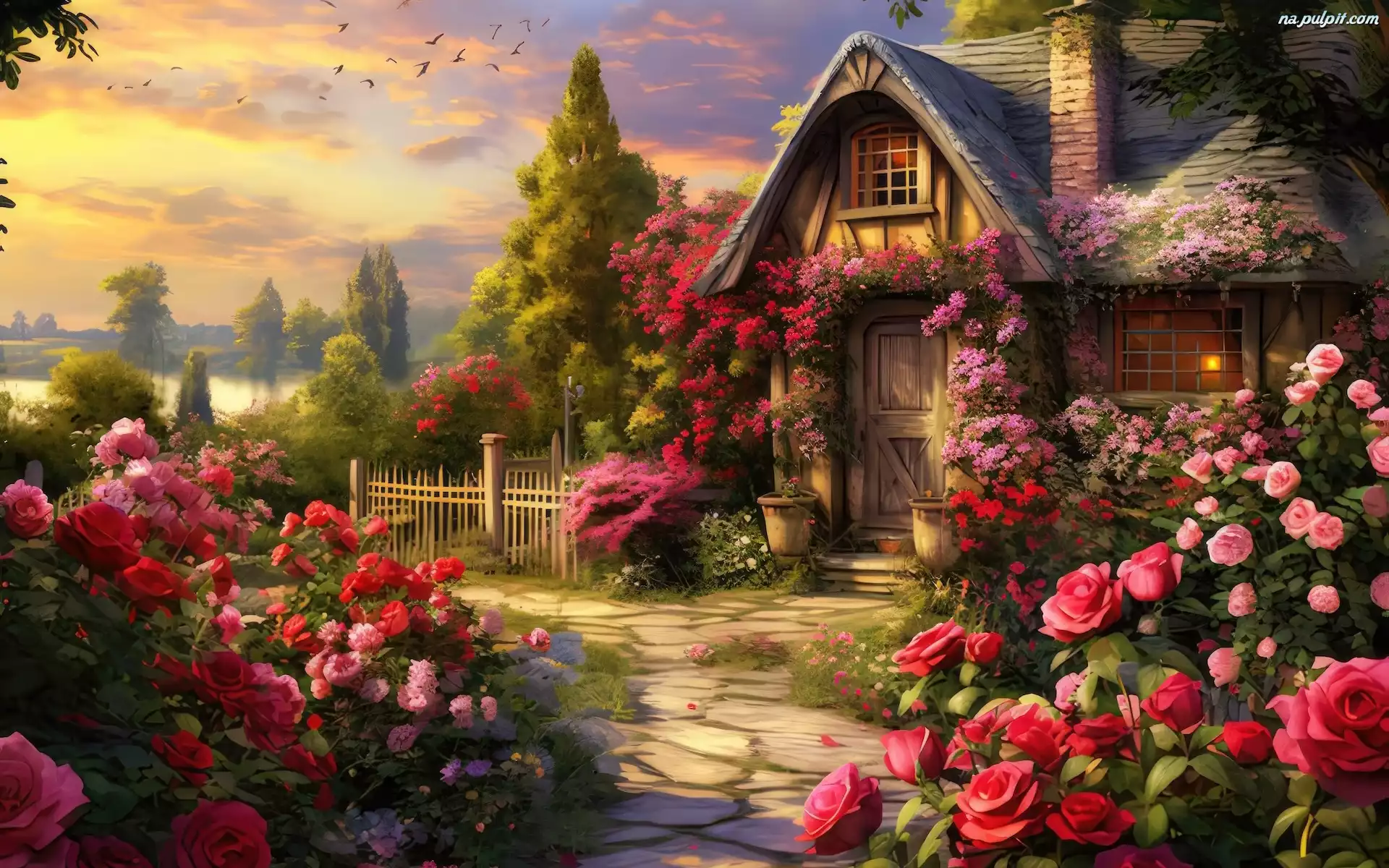 Kwiaty, Grafika, Ogród, Drzewa, Dom, Róże Na Pulpit