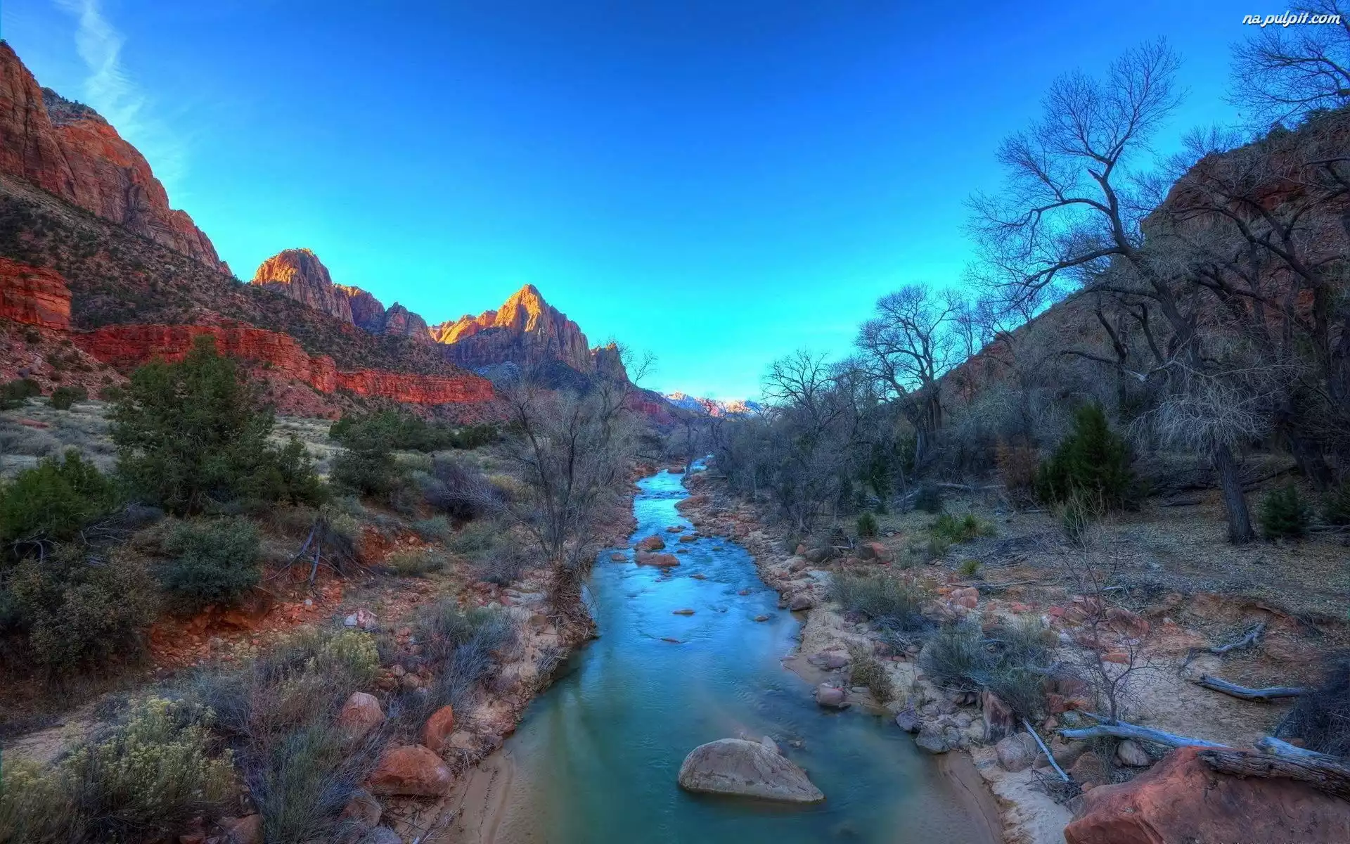 Drzewa, Góry, Rzeka, Kamienie Na Pulpit