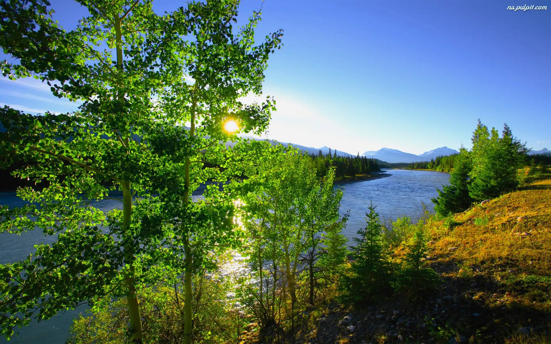 Drzewa, Promienie, Góry, Rzeka, Słońca