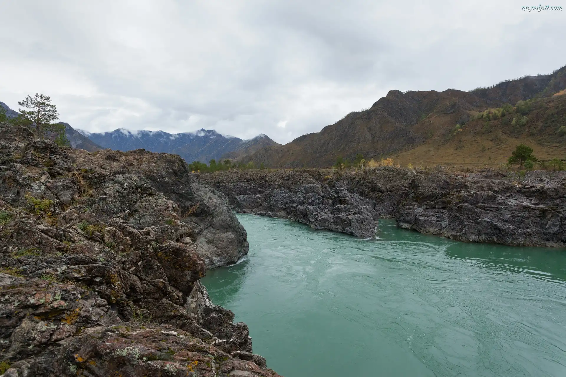 Drzewa, Góry, Rzeka, Skały Na Pulpit
