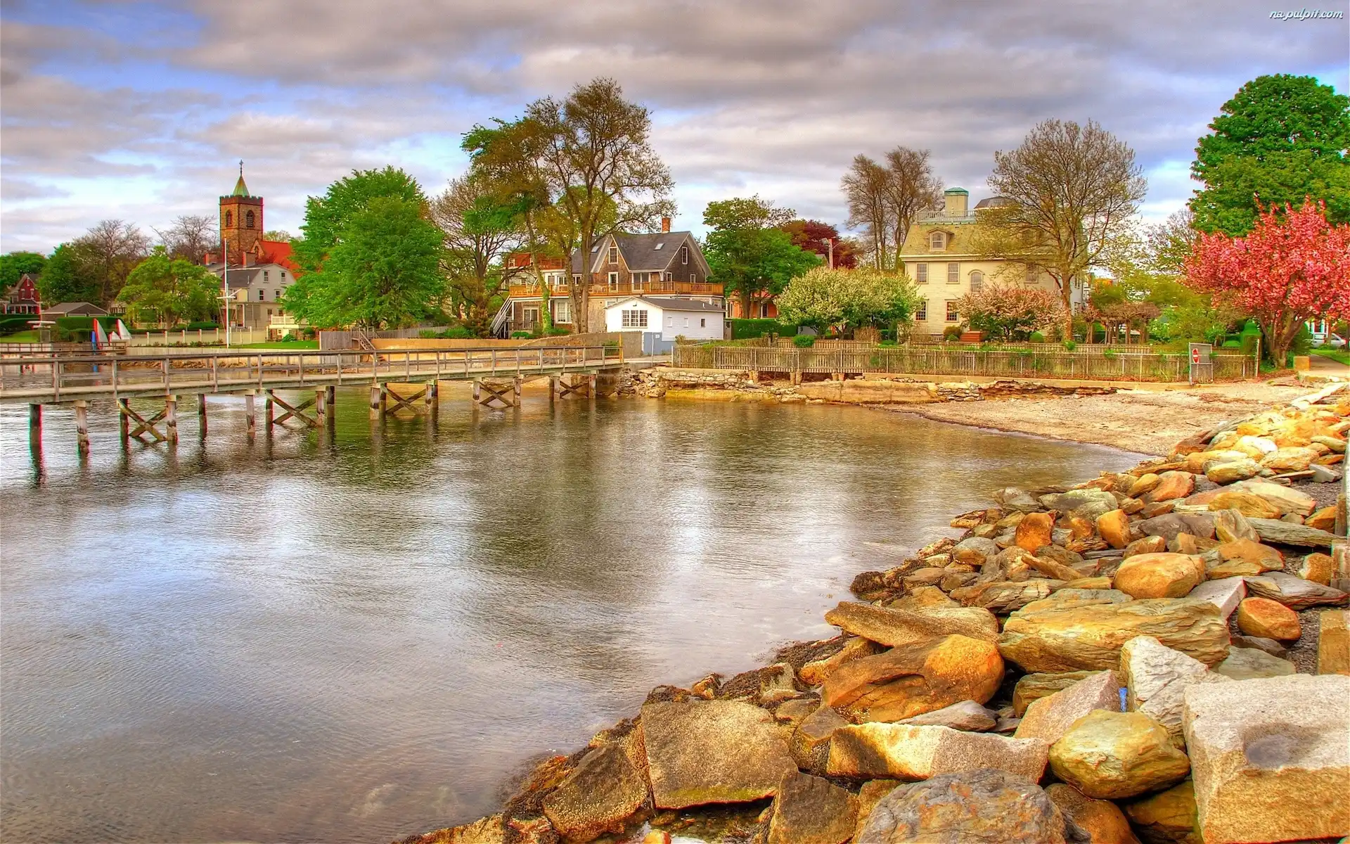 Drzewa, Domy, Kamienie, Rzeka, Kościół Na Pulpit